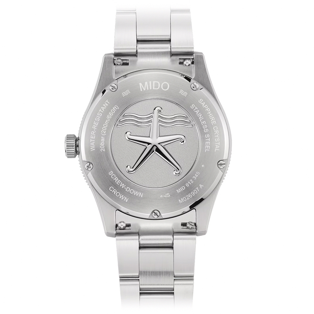 防水深度可達200米,其旋入式錶背上鐫刻品牌標誌海星圖案,象徵著MIDO在防水技術方面的悠久製錶專業