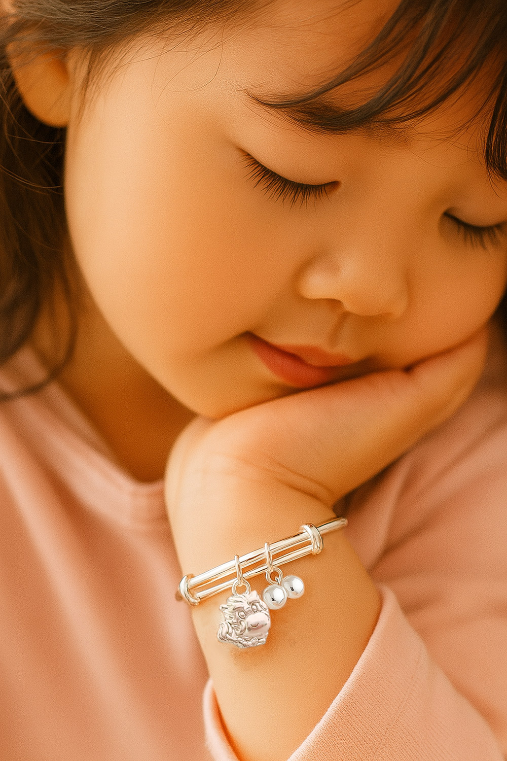 為寶貝安全,全手鐲無洞口,吊墜經焊接,僅能用剪刀剪斷,不可任意取下。