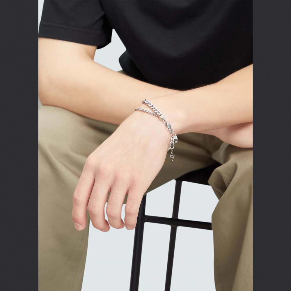 這款雙層閃電鏈條手鍊以極具層次感的設計和充滿活力的閃電元素為特色,為佩戴者帶來與眾不同的時尚體驗。其雙層粗鏈的結構,不僅強調了手鍊的份量感,還適合日常或特別場合的搭配。