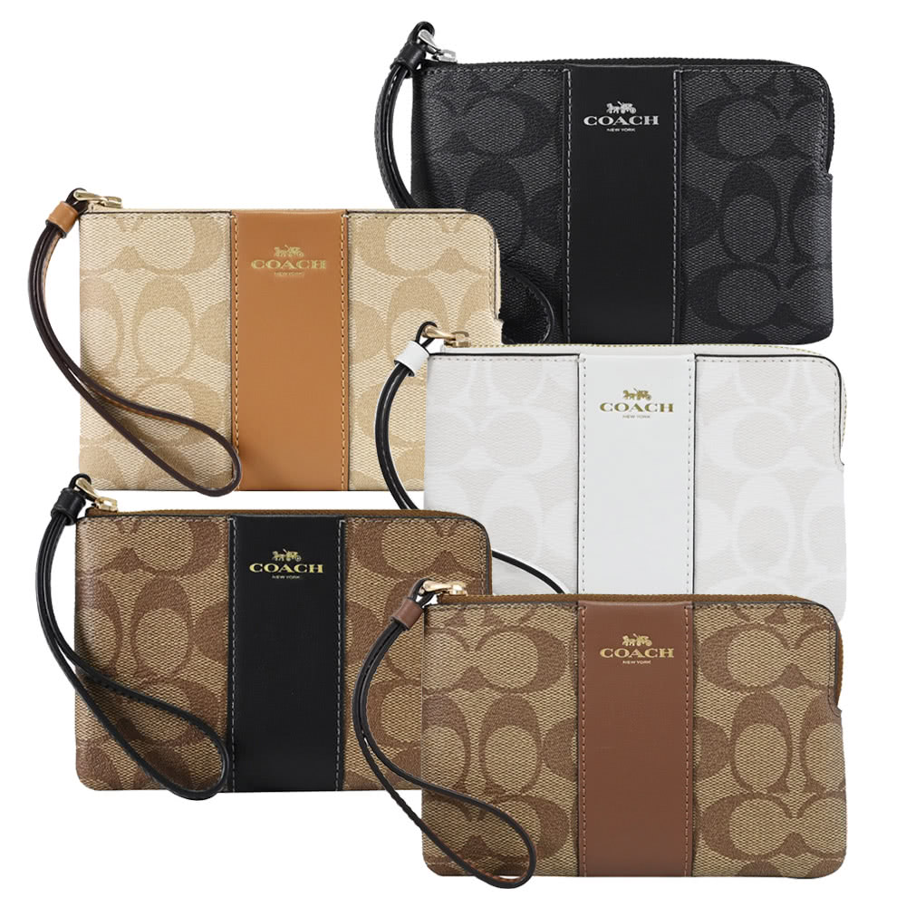COACH 專櫃款,超高人氣款式經典款手拿包,採用經典耐刮印花皮革搭配燙金馬車LOGO與撞色條紋造型,拉鍊開口/內有2卡片夾層,小巧可愛,可放5.4吋的手機,也可輕易放入各種小包,可當化妝包或手機袋或零錢包等,甜美年輕活力,是款耐用的實用單品配件。