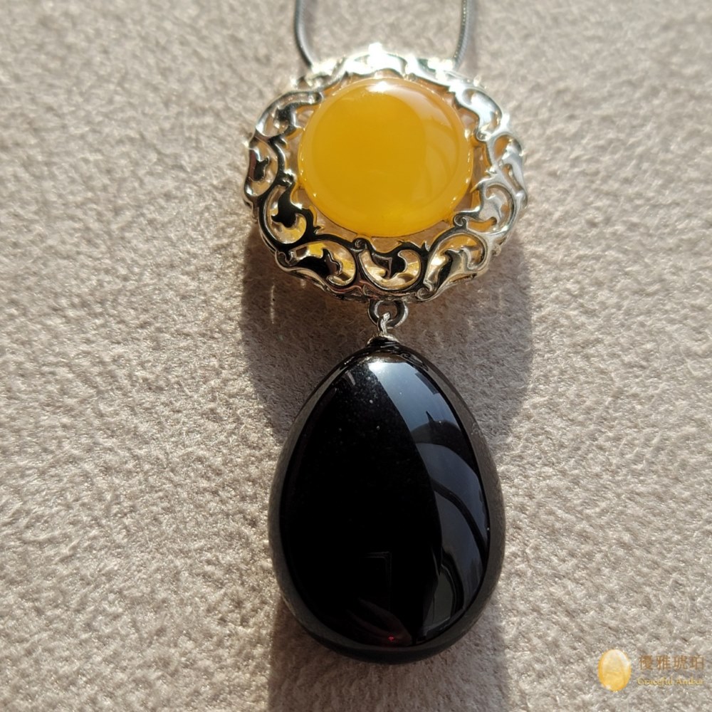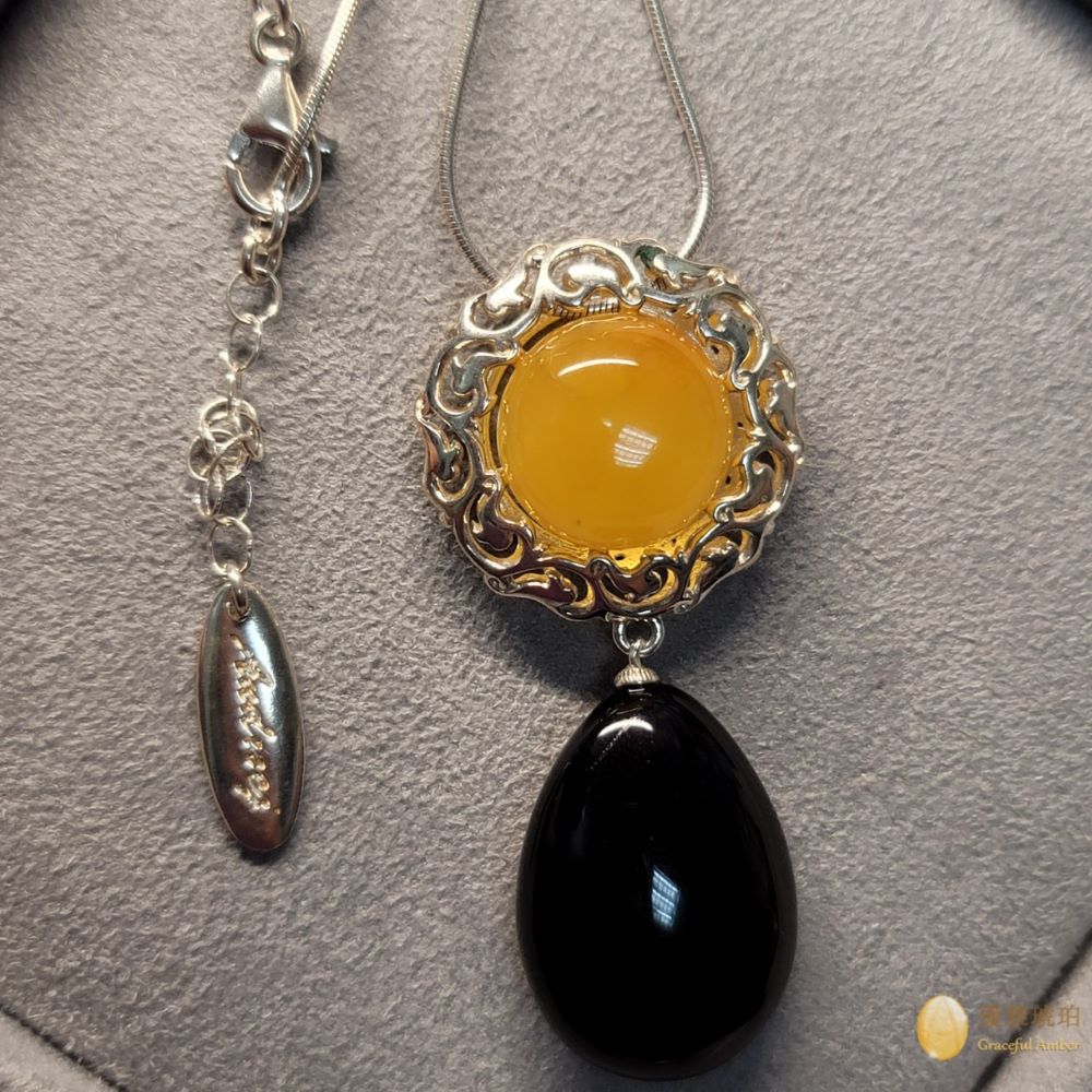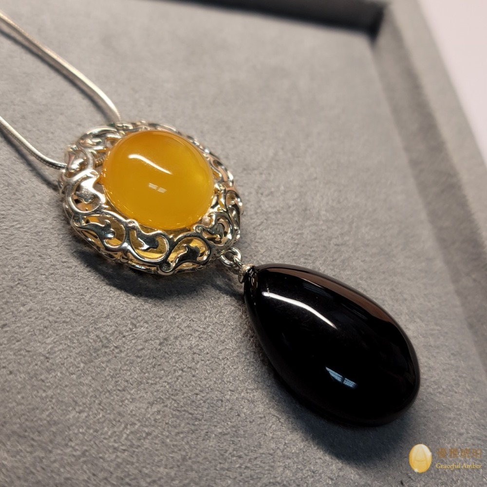【優雅琥珀】母親節禮物 金絞蜜與紅珀 銀雕項鍊(凸圓形蜜蠟與水滴形紅珀 具鑑定證書)