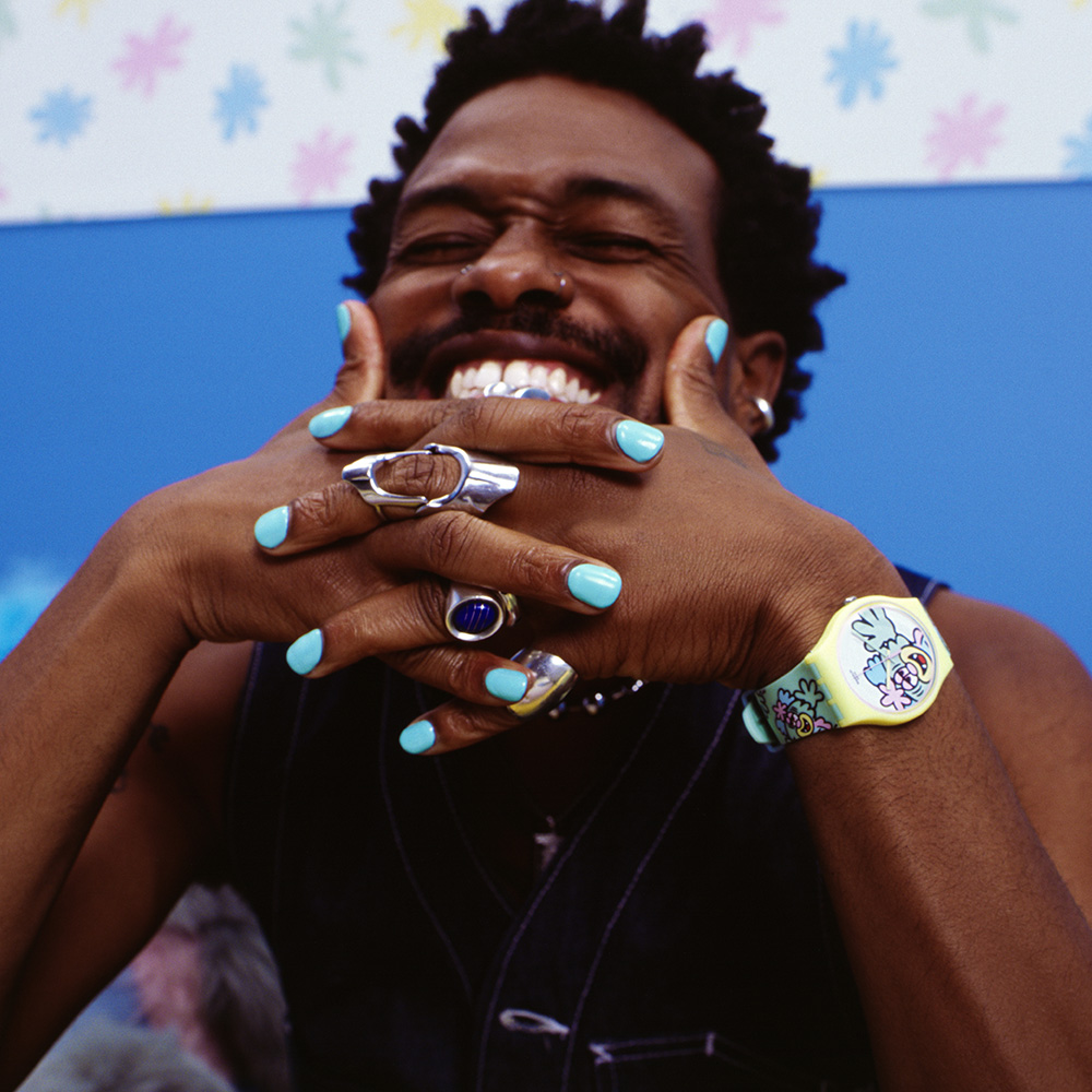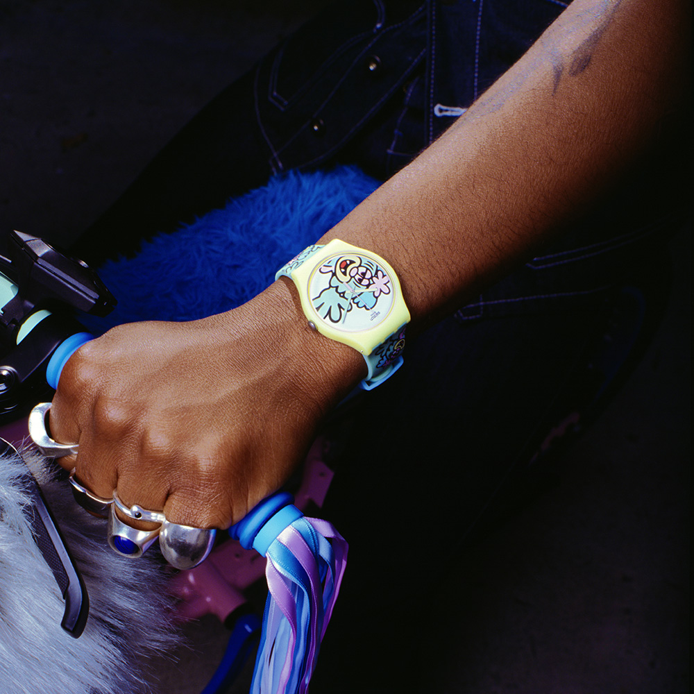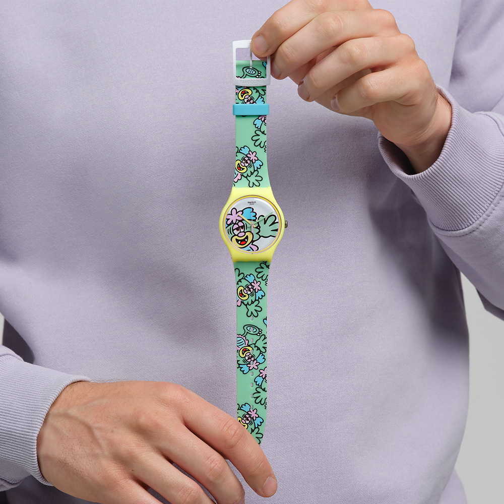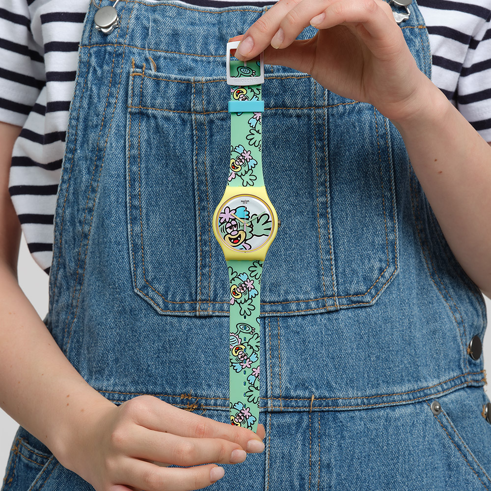Swatch x VERDY 系列這款趣味腕錶的白色錶盤上印有 VERDY 的多彩角色 Visty,置於霧面淡黃色 Biosourced 生物源材質錶殼和生物源材質錶鏡内。黃色時針、綠色分針和粉色秒針顯示時間。霧面淺綠色錶帶上同樣點綴 Visty 圖案,搭配印有 VERDY 標誌的霧面淺藍色錶環和霧面白色錶扣。