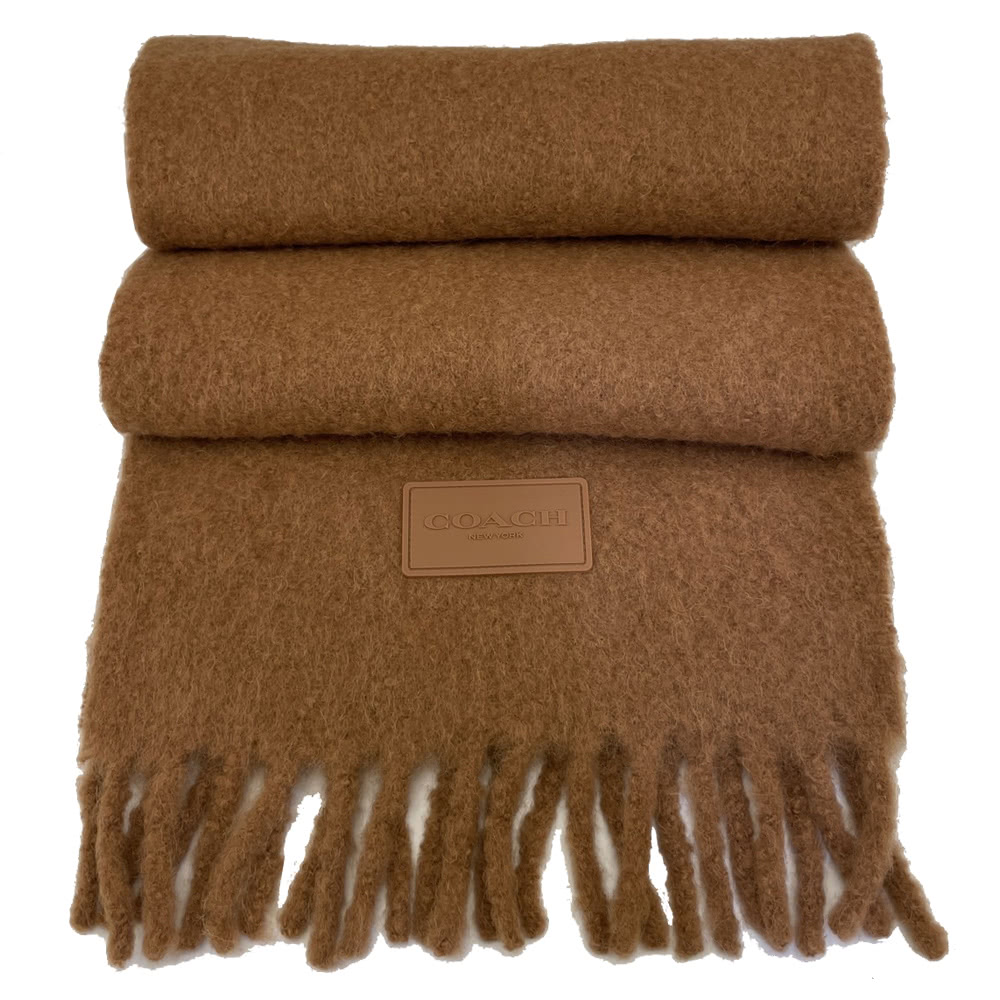 【COACH】新款方標LOGO雙面羊駝毛流蘇圍巾(棕色)