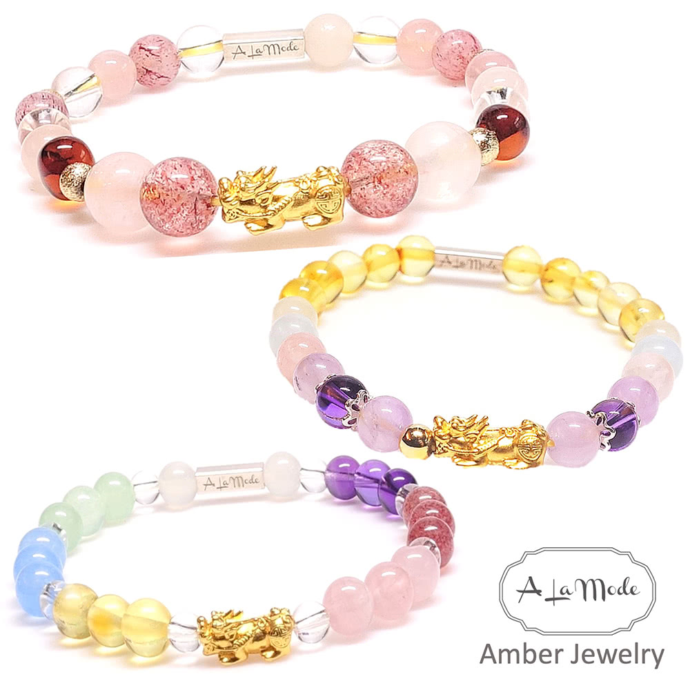 【Alamode】招財純金貔貅手鍊(多款選1)(琥珀 水晶 粉晶 紫晶)