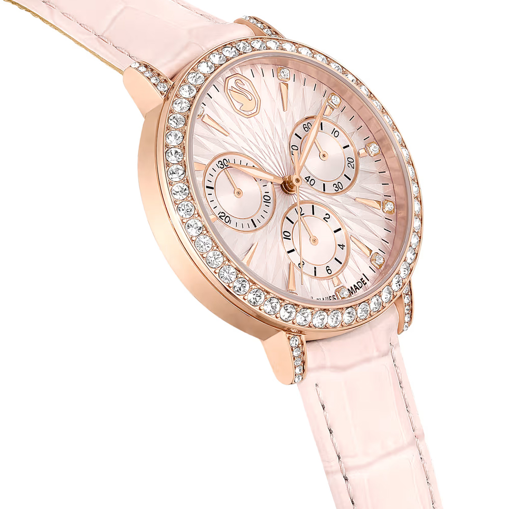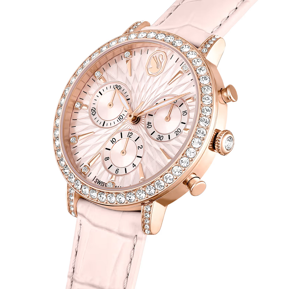這款計時腕錶呼應 Swarovski Matrix Tennis 珠寶的代表性外型,以 Swarovski 水晶展現優雅氣質。36mm 不鏽鋼設計採用玫瑰金色調飾面,並以錶圈密鑲 48 顆透明 Swarovski 水晶為特色。粉紅色錶盤以機刻雕花、圓形 Swarovski 水晶時針標示,和精緻的天鵝標誌精心打造,更顯優美。三個小錶盤以獨立的秒、分和小時計時盤完善了計時功能。縈繞手腕的粉紅色小牛皮錶帶搭配鱷魚壓紋和快開式系統,帶來佩戴舒適度。這款瑞士製錶款防水深度達 50 米,錶冠內更鑲嵌單顆 Swarovski 水晶作為點睛之筆。搭配 Matrix Tennis 系列珠寶,打造完美整體造型。