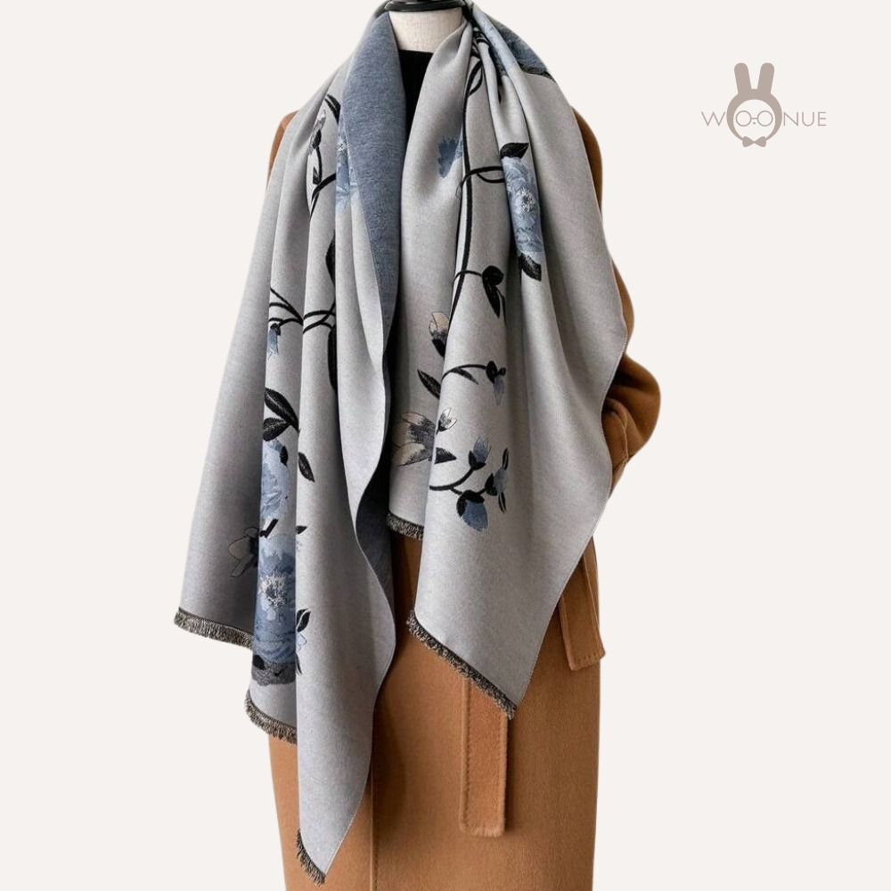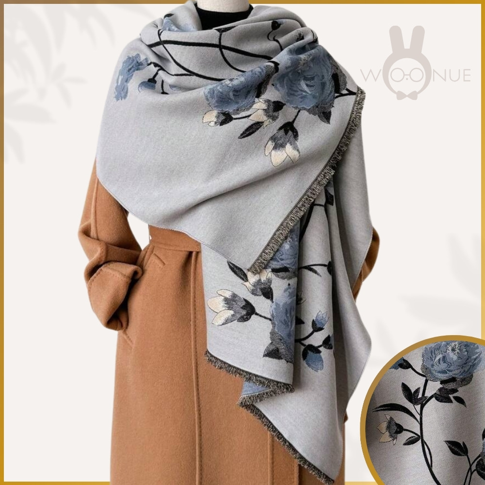 【WOONUE】超柔質感羊毛圍巾雅緻富貴牡丹藍花百搭披肩藏青(新年送禮過年閨蜜生日禮物媽媽女友老婆禮物)