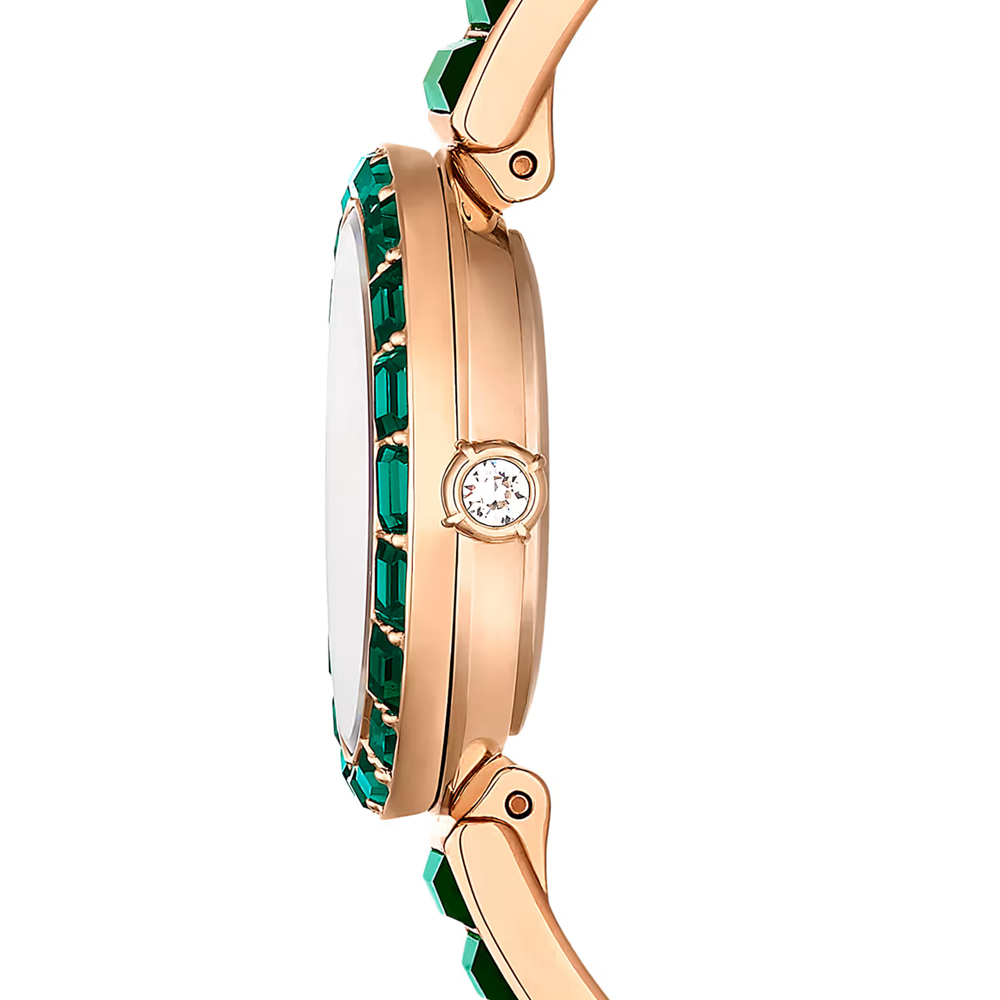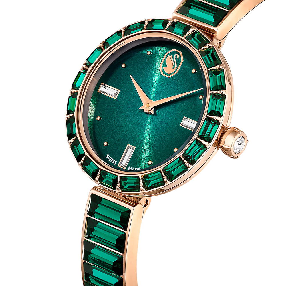 這款美麗的珠寶風時計以 Swarovski 水晶凸顯佩戴者的優雅氣質。25mm 不鏽鋼設計採用香檳金色調飾面,而錶圈周圍鑲有 20 顆法國麵包形切割綠色 Swarovski 水晶,錶冠內則鑲嵌一顆單顆 Swarovski 水晶。法國麵包形切割 Swarovski 水晶更凸顯綠色錶盤上的三個指針標示,錶盤 12 點鐘位置亦飾有天鵝標誌。手鐲式錶鏈縈繞手腕,飾有 16 顆法國麵包形切割綠色 Swarovski 水晶,完全可調式設計讓您可以舒適佩戴。這款瑞士製錶款防水深度達 50 米,是訴說令人著迷的風格故事的理想配件。