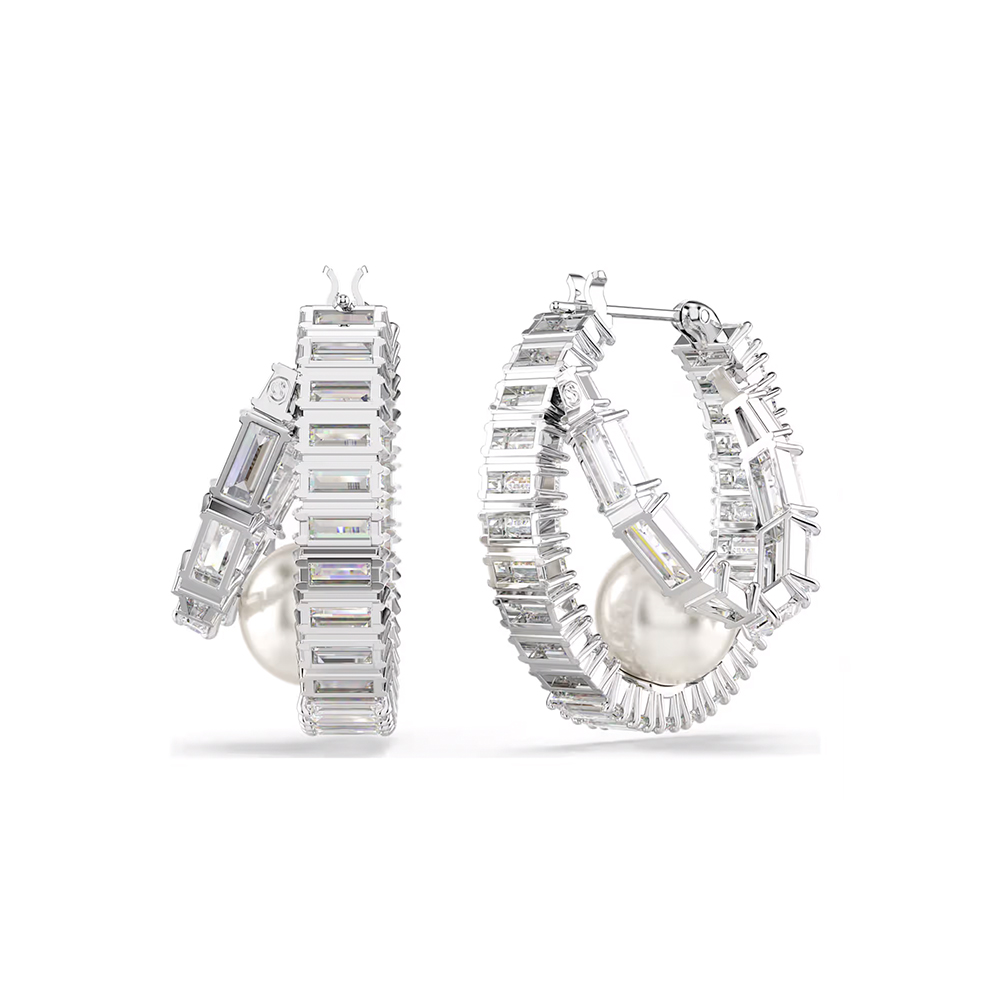 擁抱為經典大圈款式賦予的現代風味。這款亮麗的穿式耳環雙耳均採用鍍銠材質,並鑲嵌滿滿法國麵包形切割 Swarovski 鋯石。每只大圈底部均飾有單顆 Swarovski 水晶珍珠,為整體造型更添奢華。以這款穿式耳環搭配其他成套珠寶,打造您展現自我的個性組合。