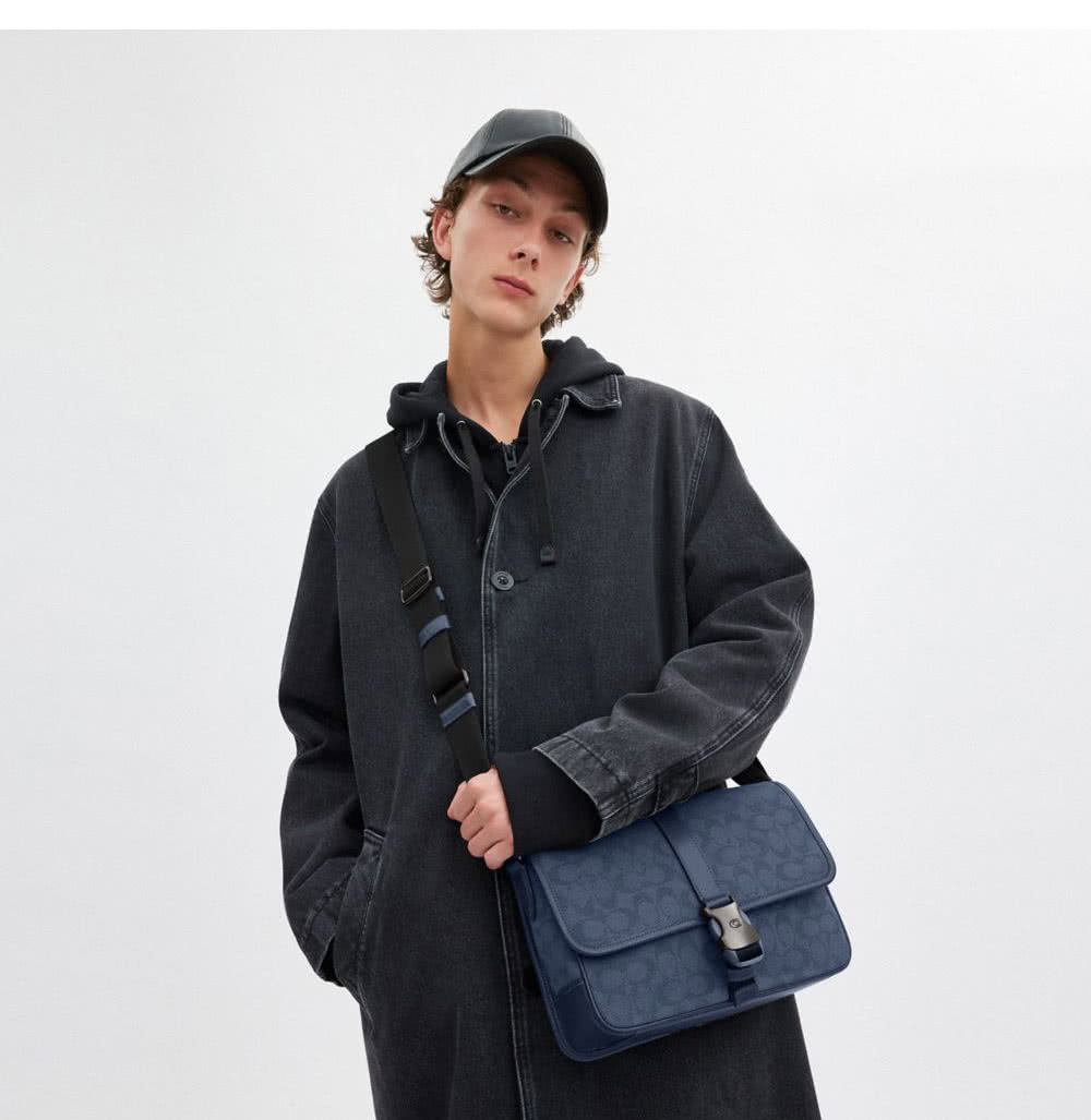 【COACH】蔻馳官方直營 LEAGUE經典Logo郵差包 騎行手袋 騎行包 斜背包-水洗布藍色(CU041)