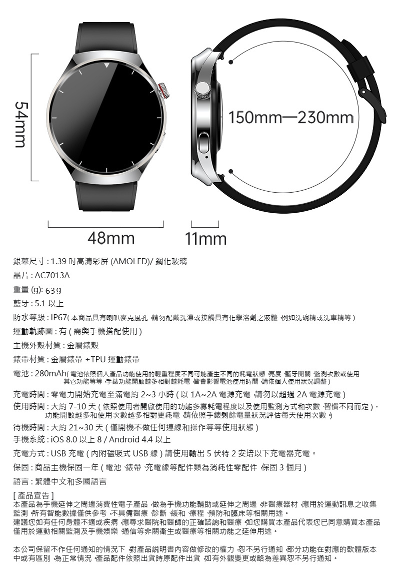 商品主體保固一年(電池、錶帶、充電線等配件類為消耗性零配件,保固3個月)