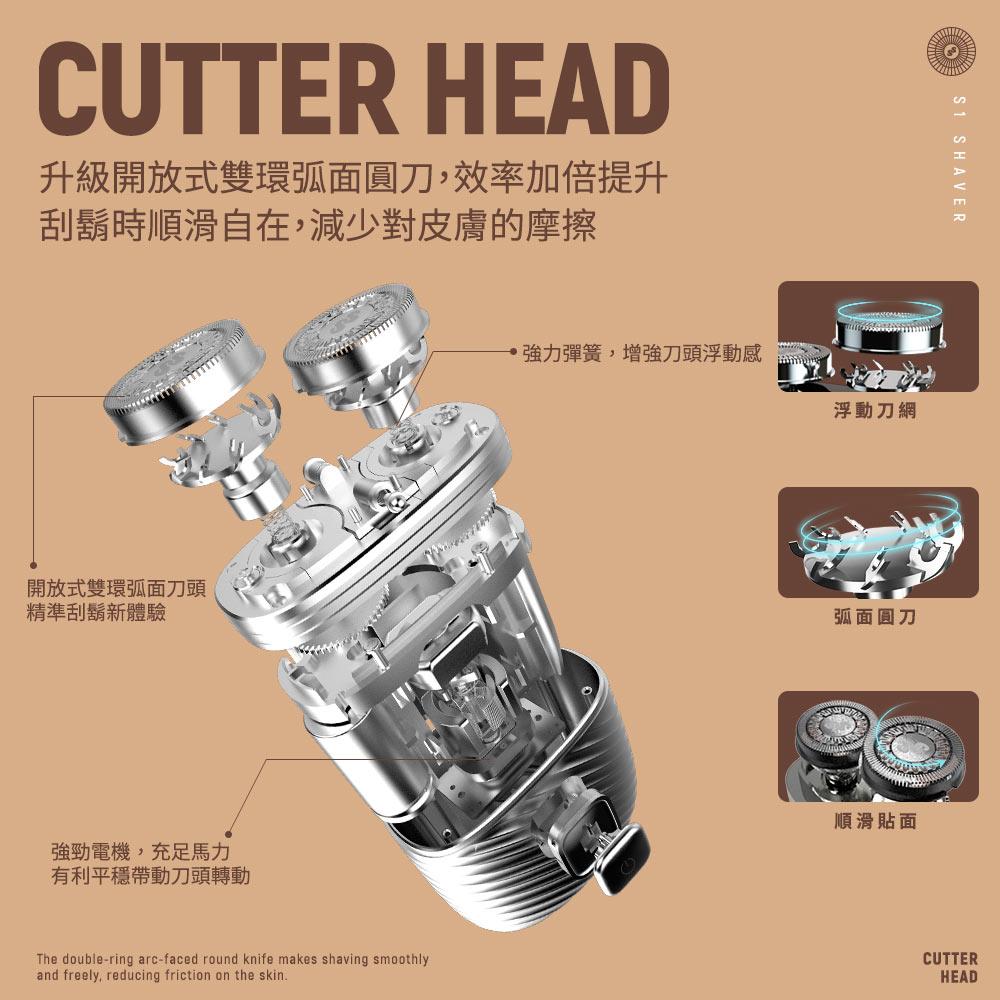 (7) 雙環開放式圓刀+獨立浮動刀網,順滑貼面的刀頭舒適觸及臉 部輪廓