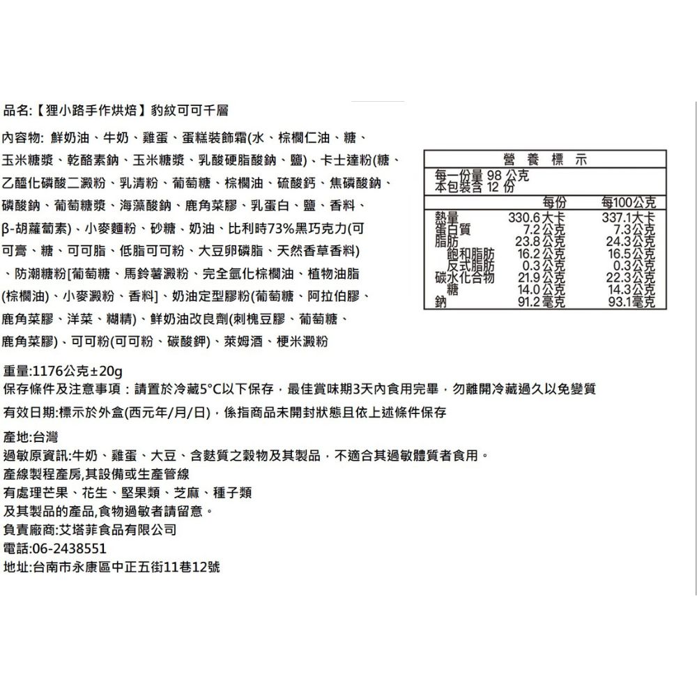 【狸小路手作烘焙】豹紋可可千層8吋1入(生日蛋糕;母親節;父親節;慶生;下午茶;點心;甜點;雙11)