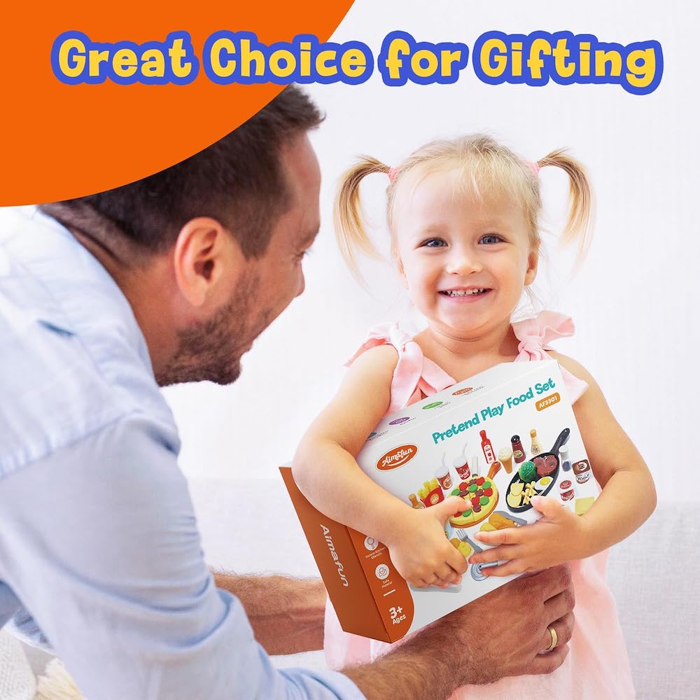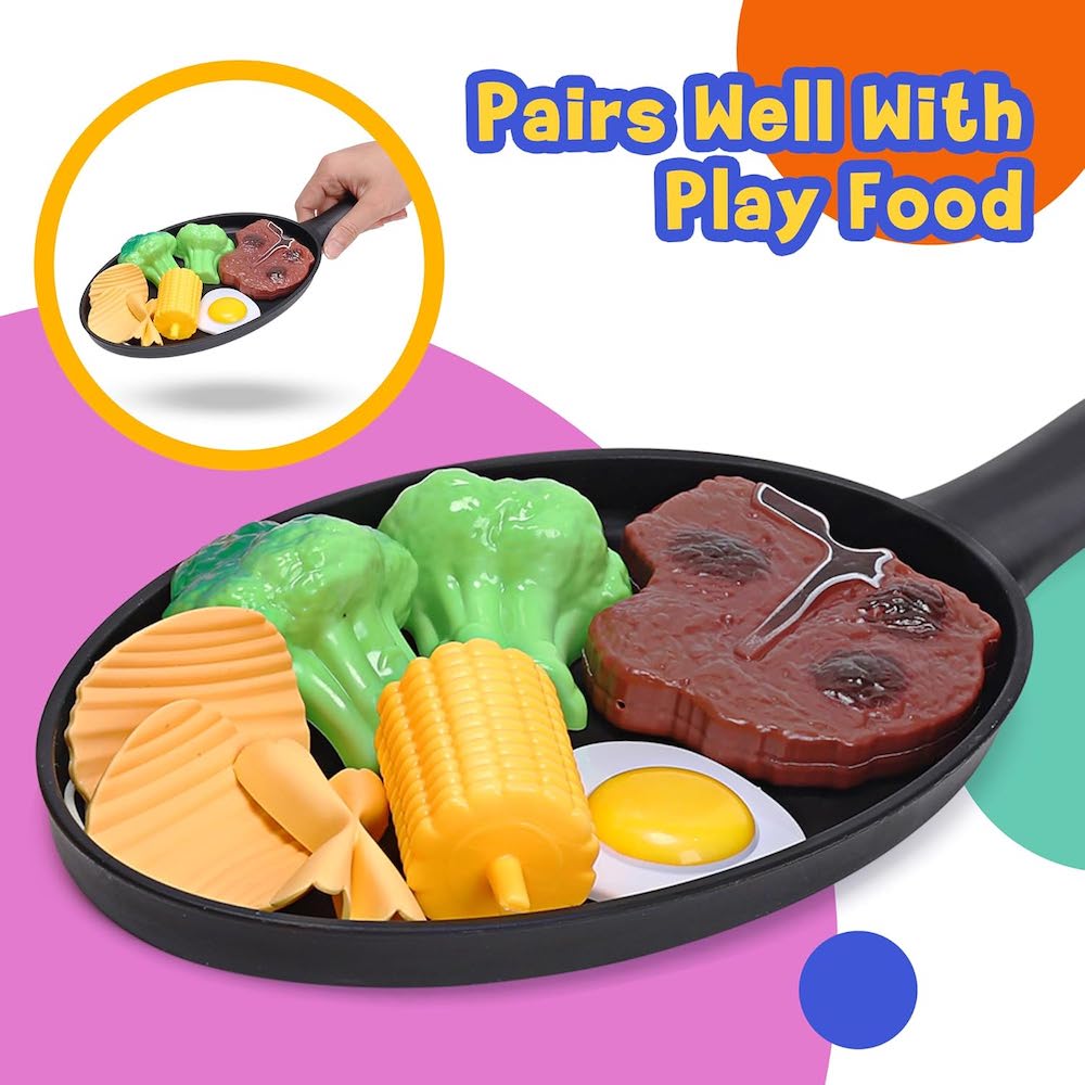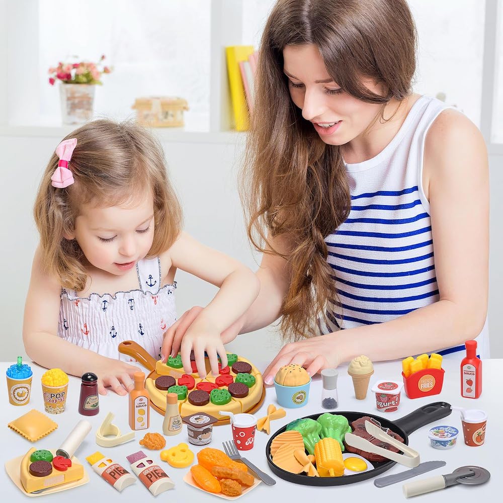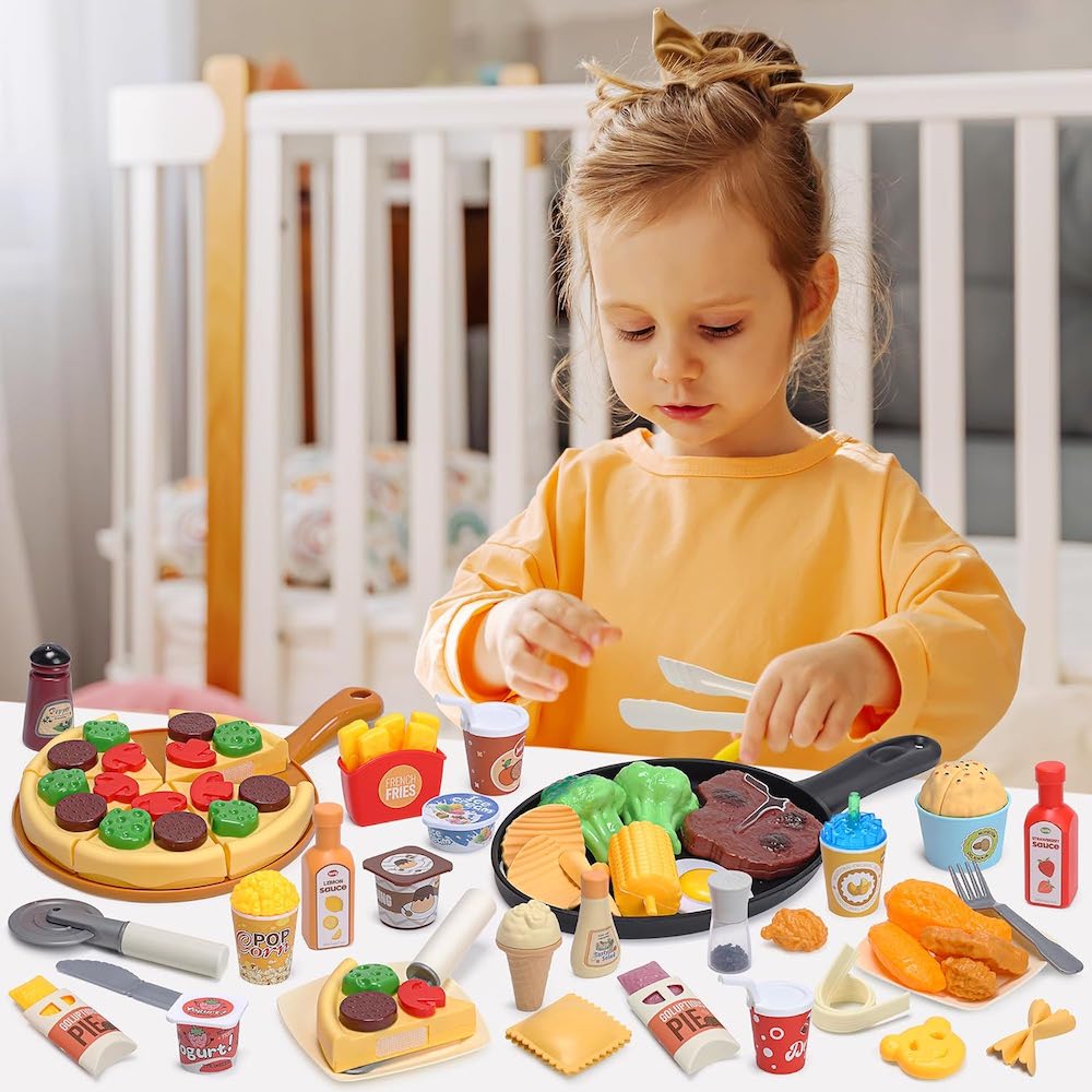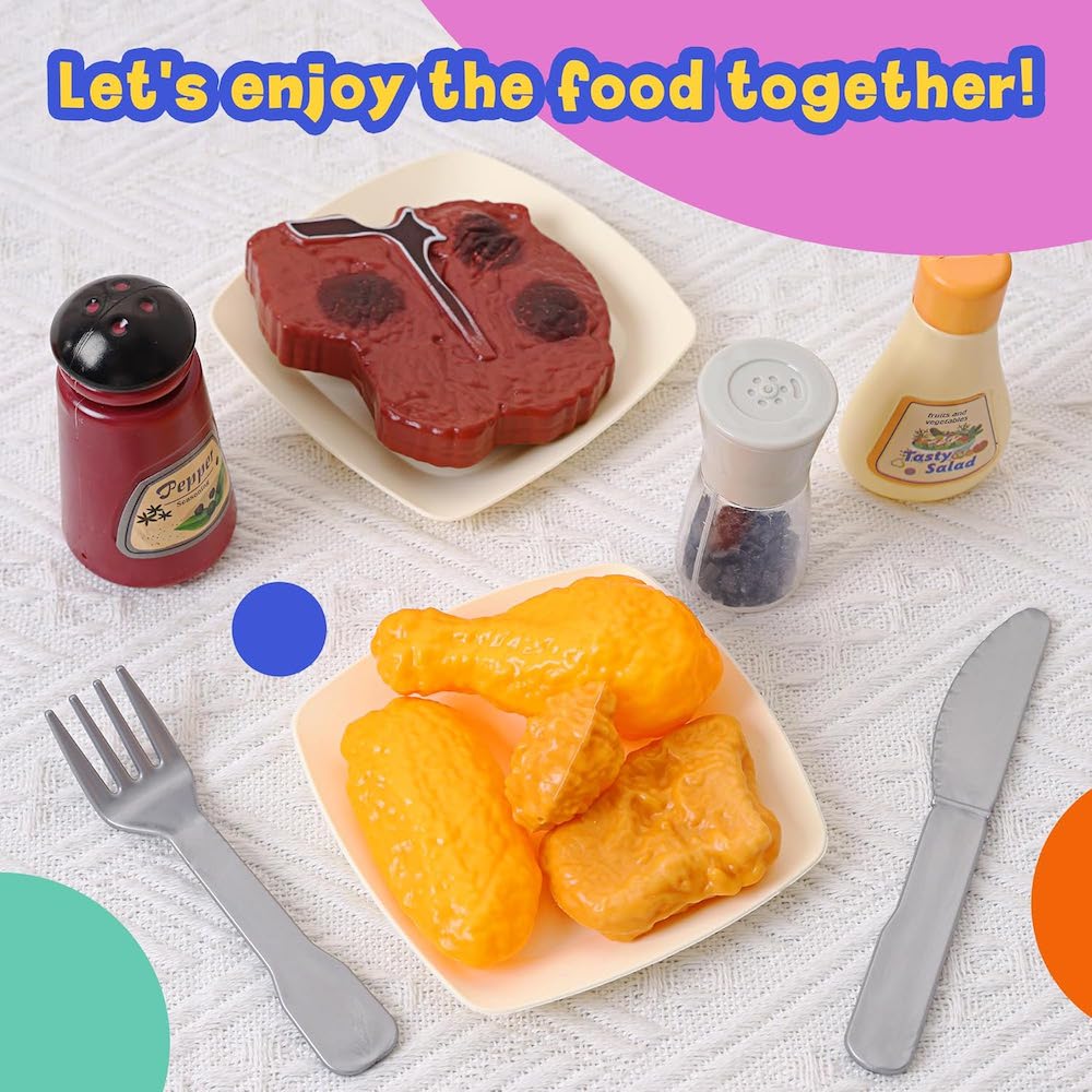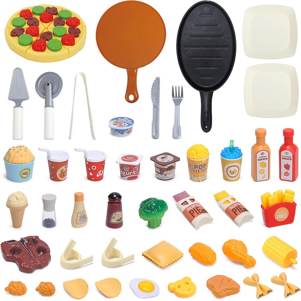 披薩、牛排、炸雞、玉米、冰淇淋、可樂、甜甜圈、爆米花……超過30種仿真食物+廚具配件,一次滿足孩子當小廚師的夢想!