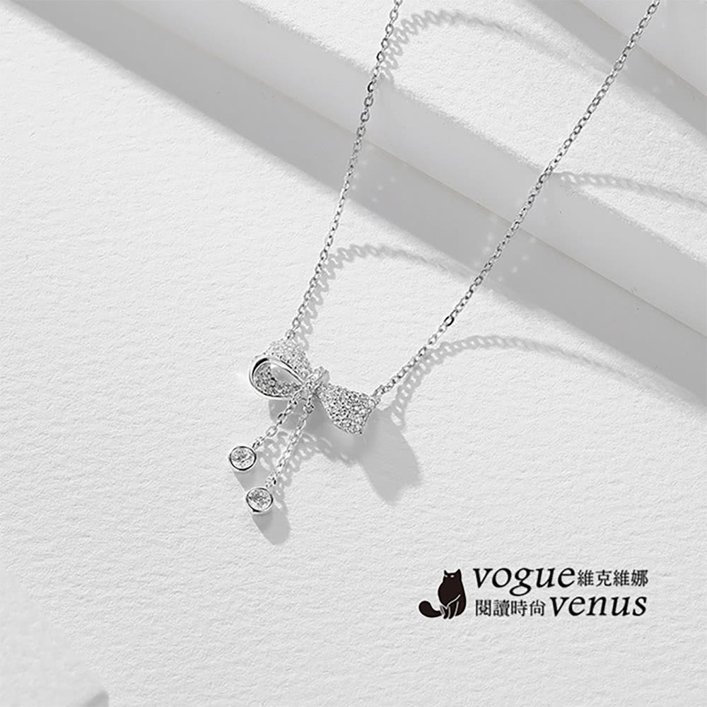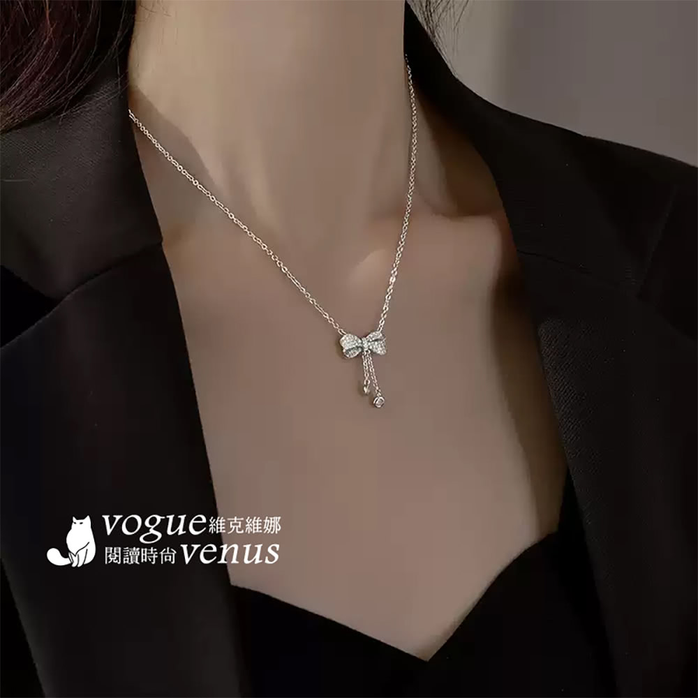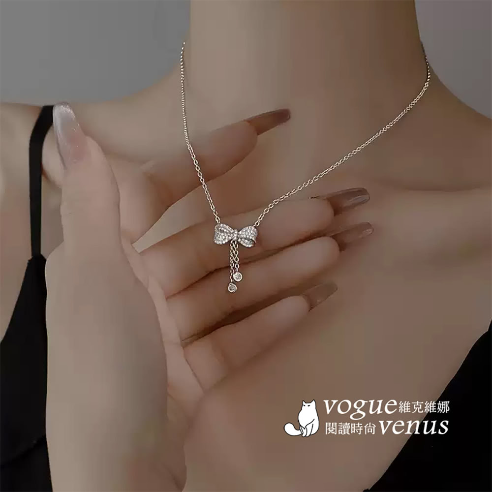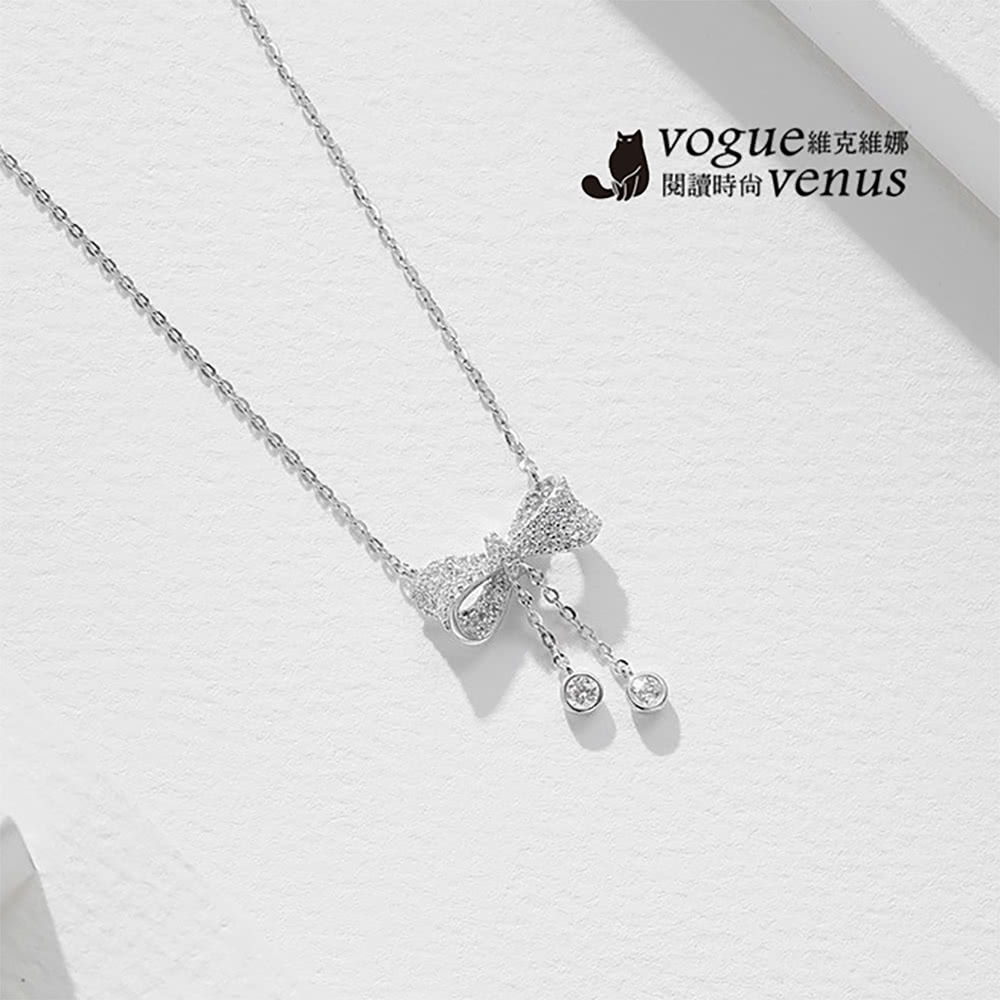 【維克維娜】立體蝴蝶結水鑽流蘇925純銀項鍊