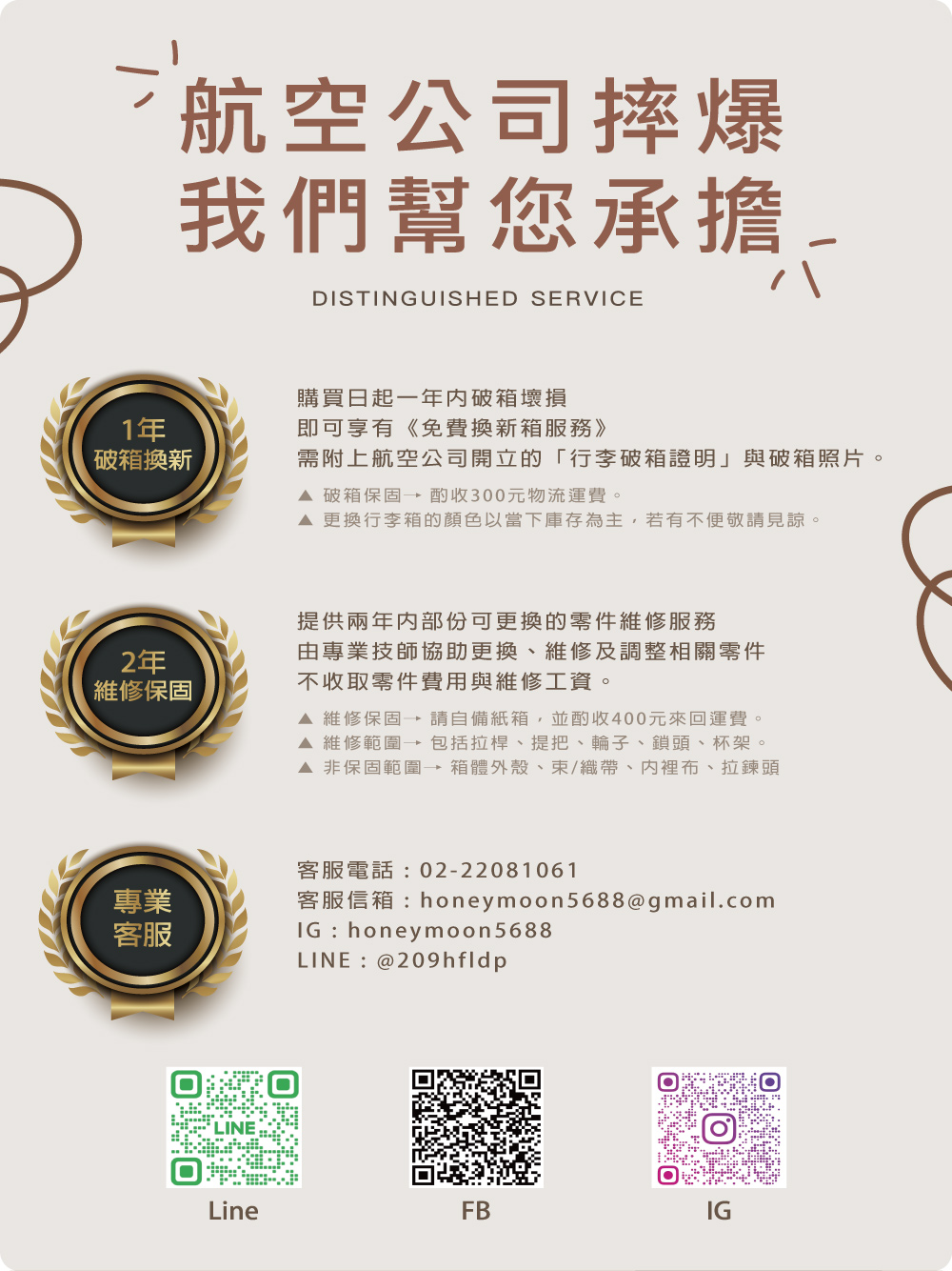 購買日起一年內破箱壞損,即可享有《免費換新箱服務》,需附上航空公司開立「行李破箱證明」與破箱照片(顏色以當下為主)