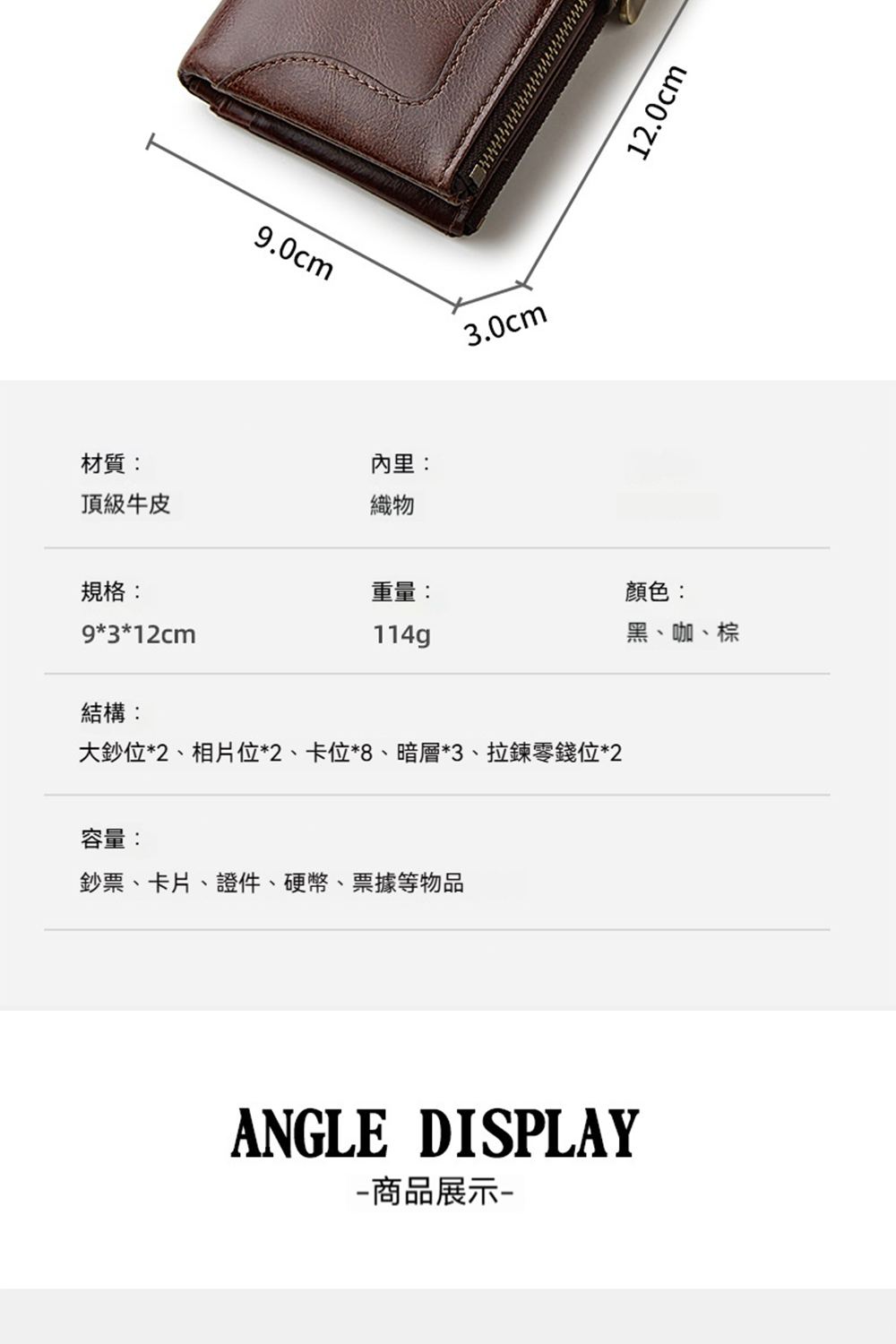 👜容量 / 結構:大鈔位*2、相片位*2、卡位*8、暗層*3、拉鍊零錢位*2