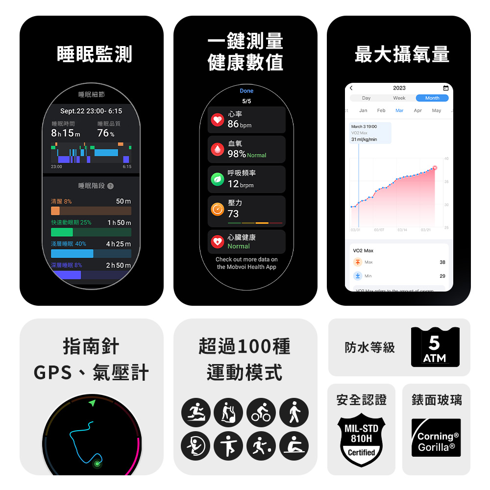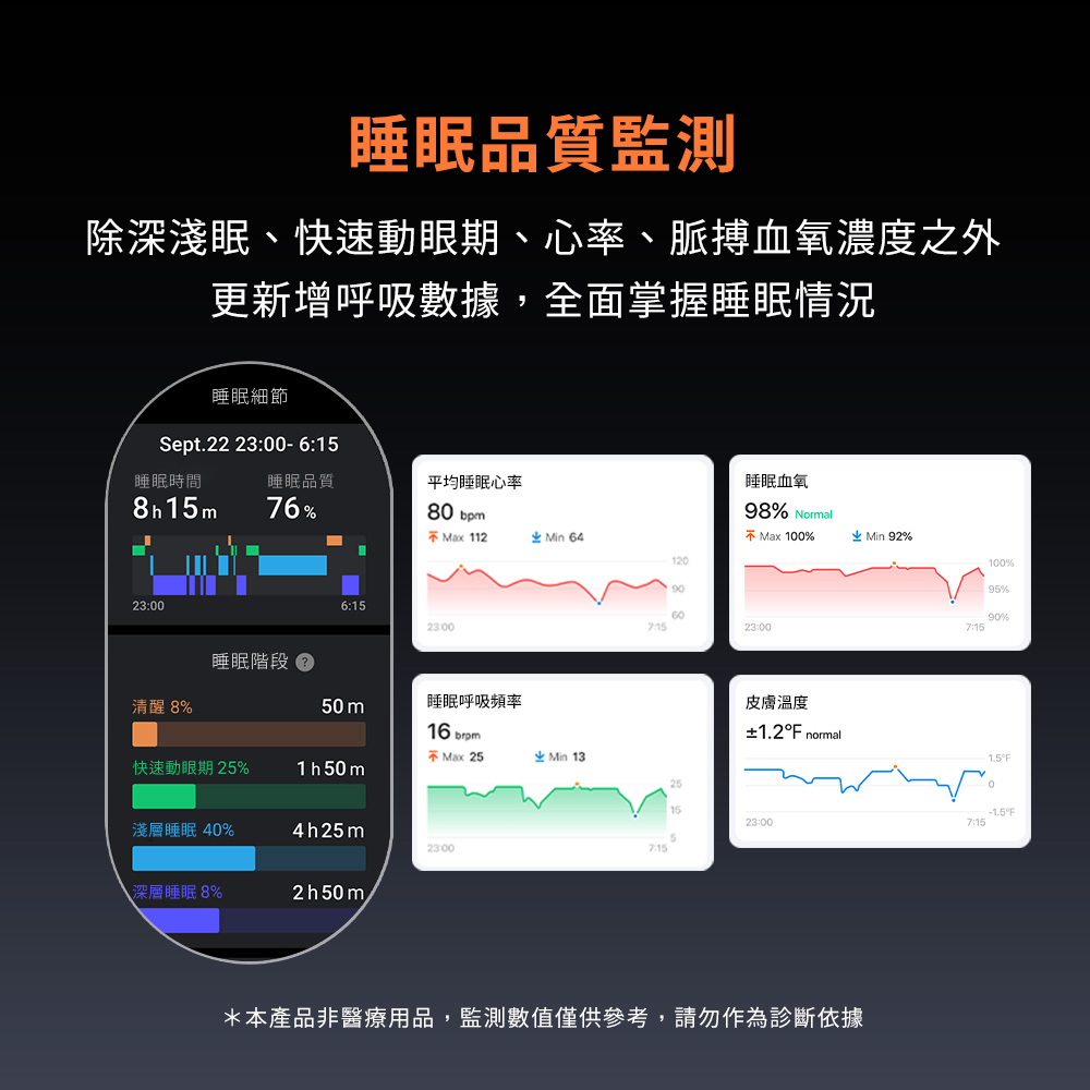 感應器:加速度計、陀螺儀感應器、HD PPG心律感應器、SpO2 傳感器、皮膚溫度傳感器、低延遲穿戴傳感器、氣壓計、指南針