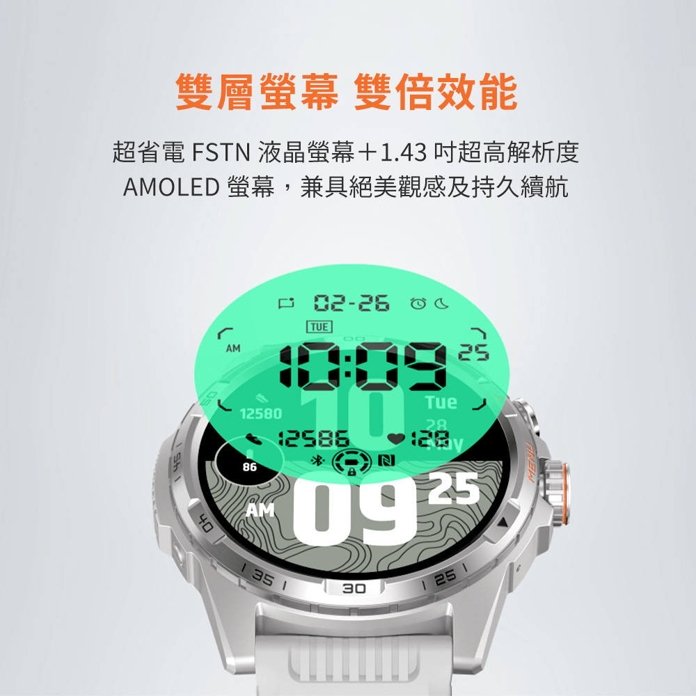 採用1.43吋466*466解析度AMOLED,像素密度達326ppi視網膜等級,完美呈現畫面細節;超省電FSTN液晶螢幕,低功耗加倍續航