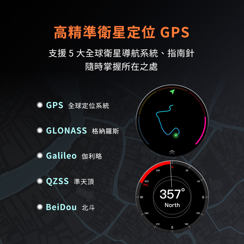 支援GPS、GLONASS、Galileo、QZSS 、北斗等5大衛星導航系統,輔以內建的指南針、羅盤、氣壓計,無論身在何處,輕鬆掌握精準定位