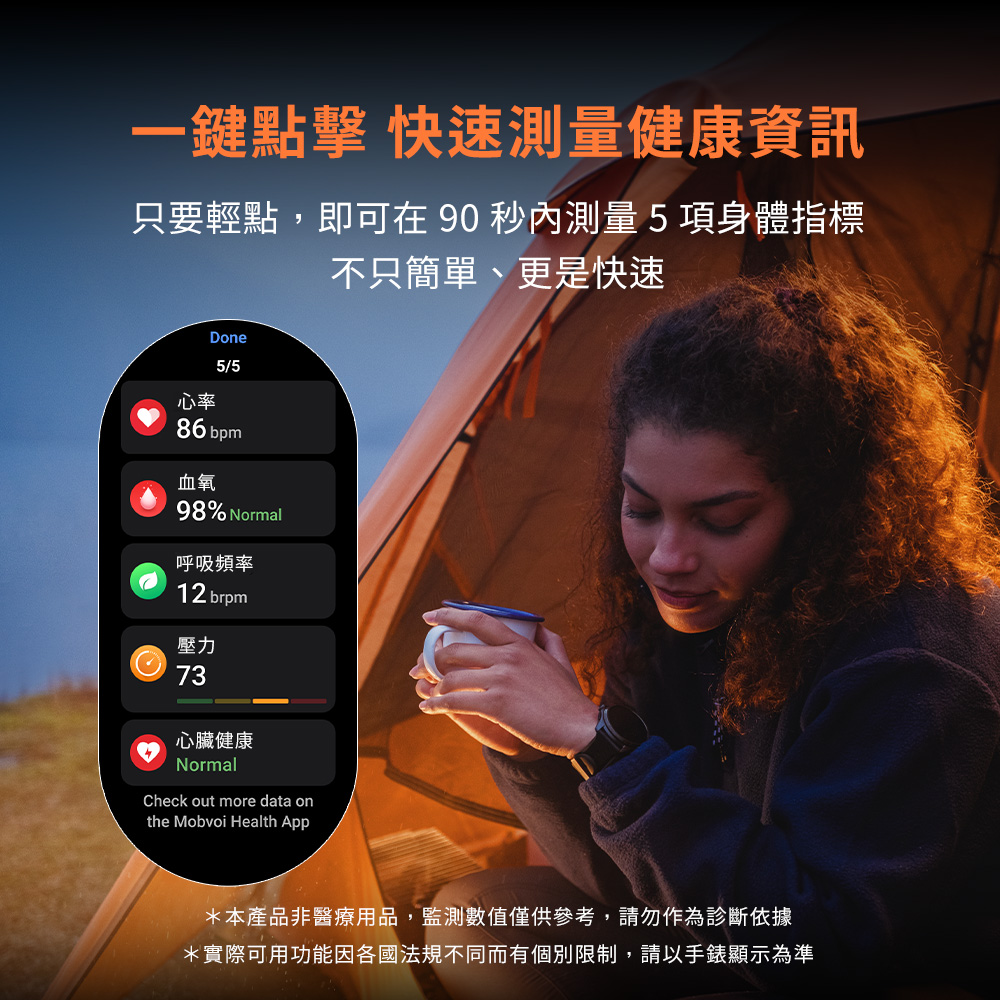 只要輕點,即可在90秒內測量心率、血氧、呼吸頻率、壓力、心臟健康等5項身體指標,不只簡單、更是快速