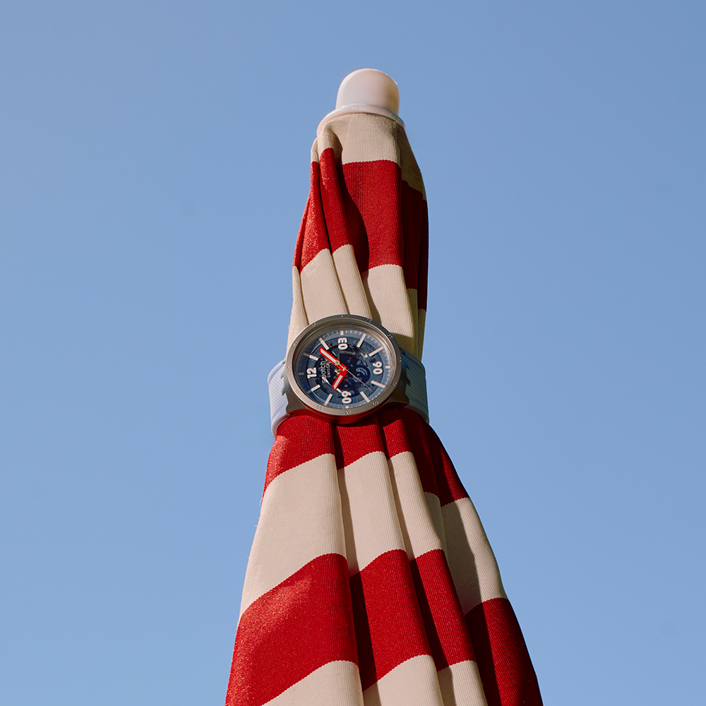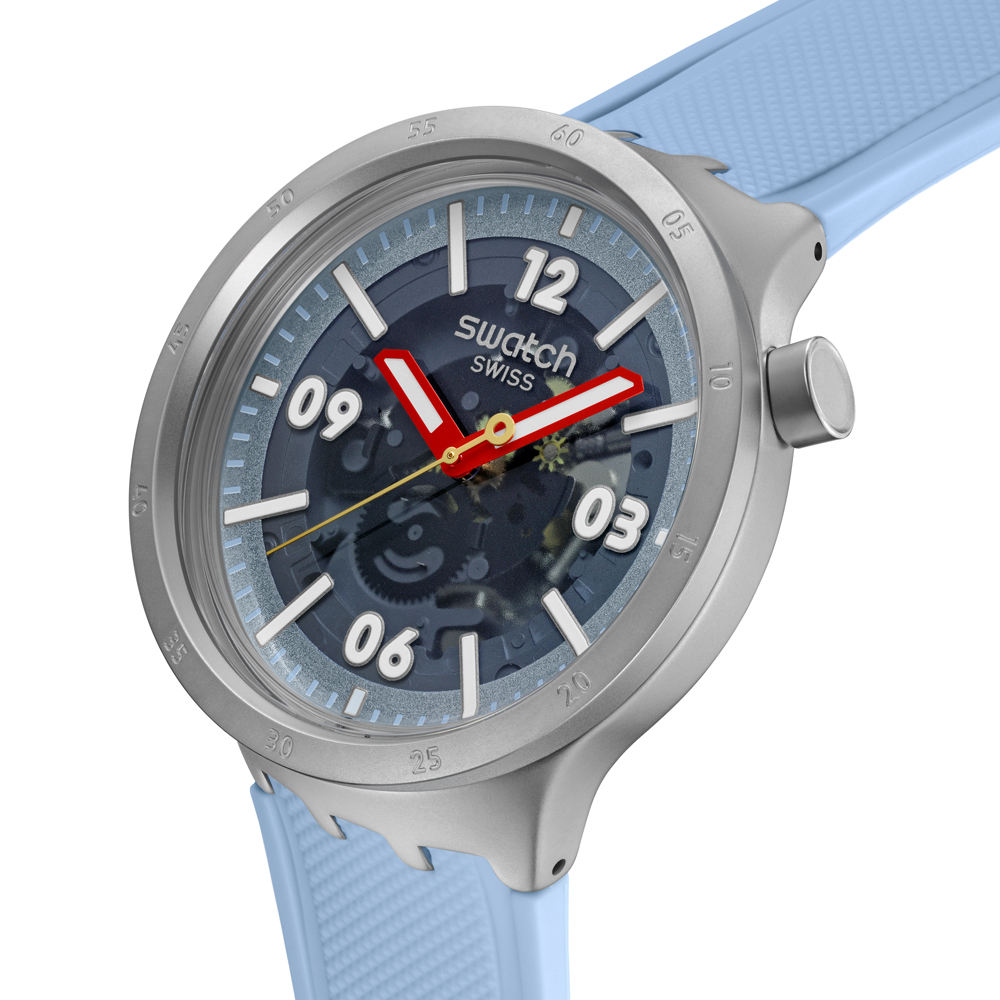 這款超大尺寸腕錶設計以透明錶盤搭配淺藍色閃亮外環、夜光白色印刷時標和數字以及淺藍色印刷分鐘刻度脫穎而出。夜光紅色時針和分針以及金色秒針指示時間。噴砂不鏽鋼錶殼搭配相襯的錶圈和按把,與霧面淺藍色紋理錶帶和錶環以及噴砂不鏽鋼半扣。