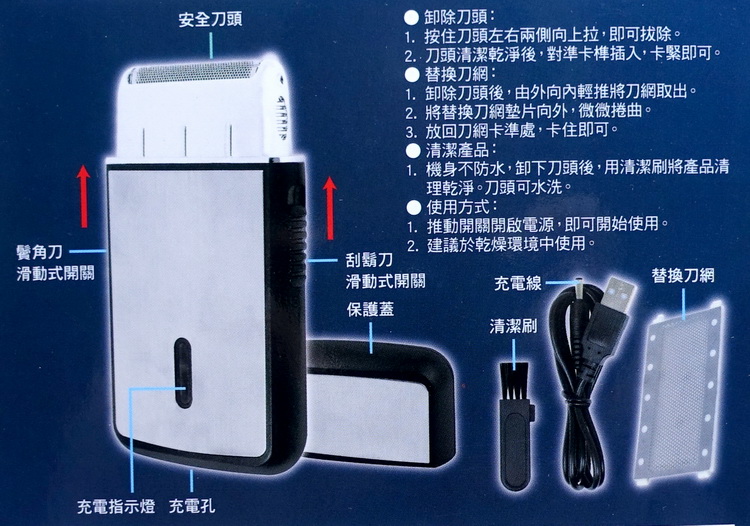 ■超薄彈性刀網,上推式開關■名片型大小,體積小攜帶方便■安全鋼刀刀刃,安全不傷肌膚■強力馬達,鬢角刀設計■USB充電式設計,充電中指示燈紅燈/充飽電燈不滅(請自行計算充電時間約8小時)■可拆式刀頭,方便清洗清潔