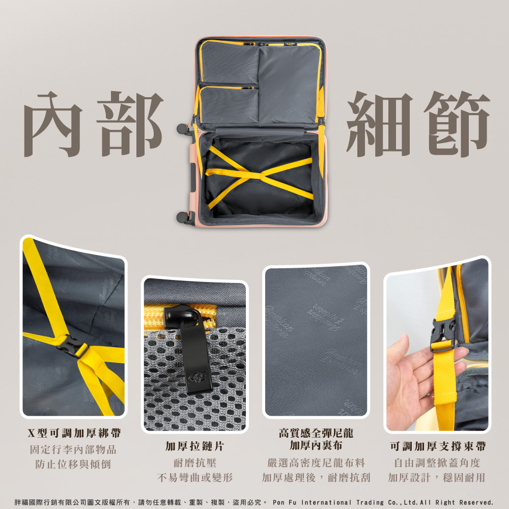 ● 內裏前蓋附有三個立體收納口袋,彈性收納更便利,底部設有X型可調式插扣綁帶,簡單固定行李,加厚拉鍊片設計,堅固又耐用
