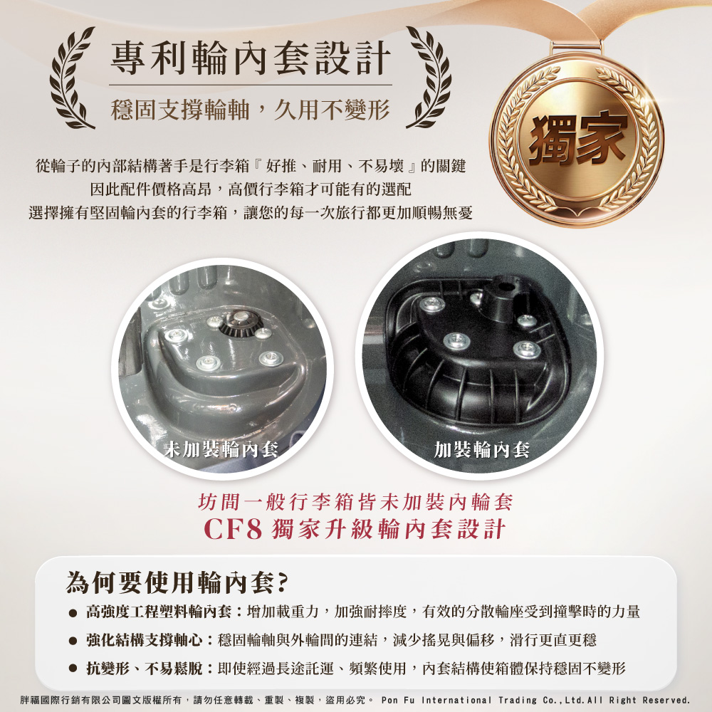 ◆ 專利輪內套設計,穩固支撐輪軸,久用不變形,從輪子的內部結構著手是行李箱「好推、耐用、不易壞」的關鍵,因此配件價格高昂,高價行李箱才可能有的選配,選擇擁有堅固輪內套的行李箱,讓您的每一次旅行都更加順暢無憂