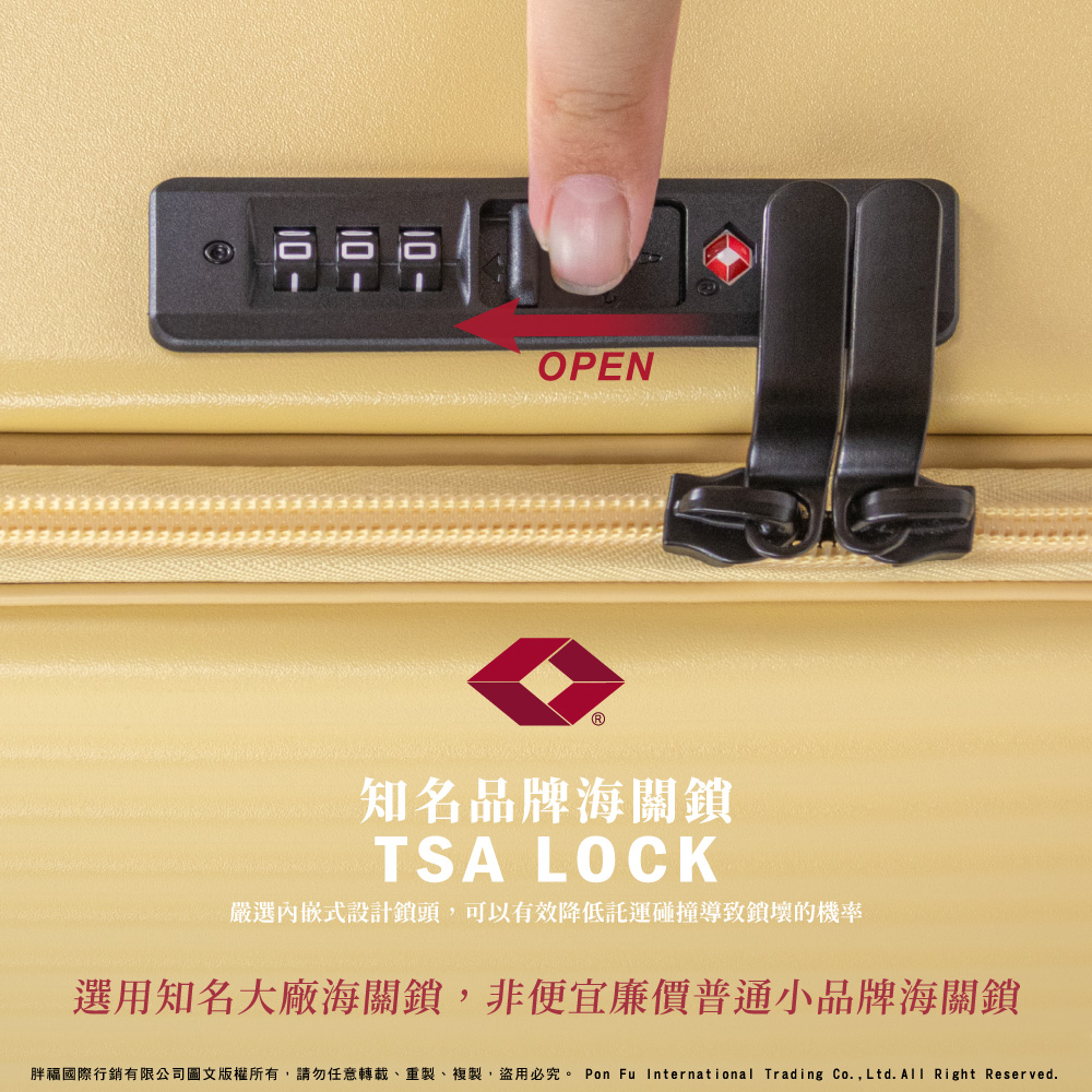CF8 鎖頭:知名大廠內嵌式TSA海關鎖,非便宜廉價普通小品牌海關鎖,可以有效降低託運碰撞導致鎖壞的機率