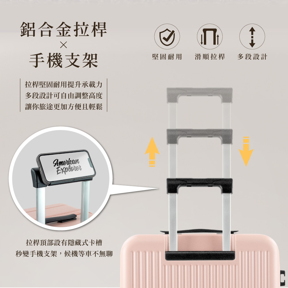 CF8 拉桿:多段式輕量鋁合金拉桿,堅固耐用且不易變形,可依使用者喜好隨意調整高度,拉桿握把上設有手機支架,放開雙手超輕鬆
