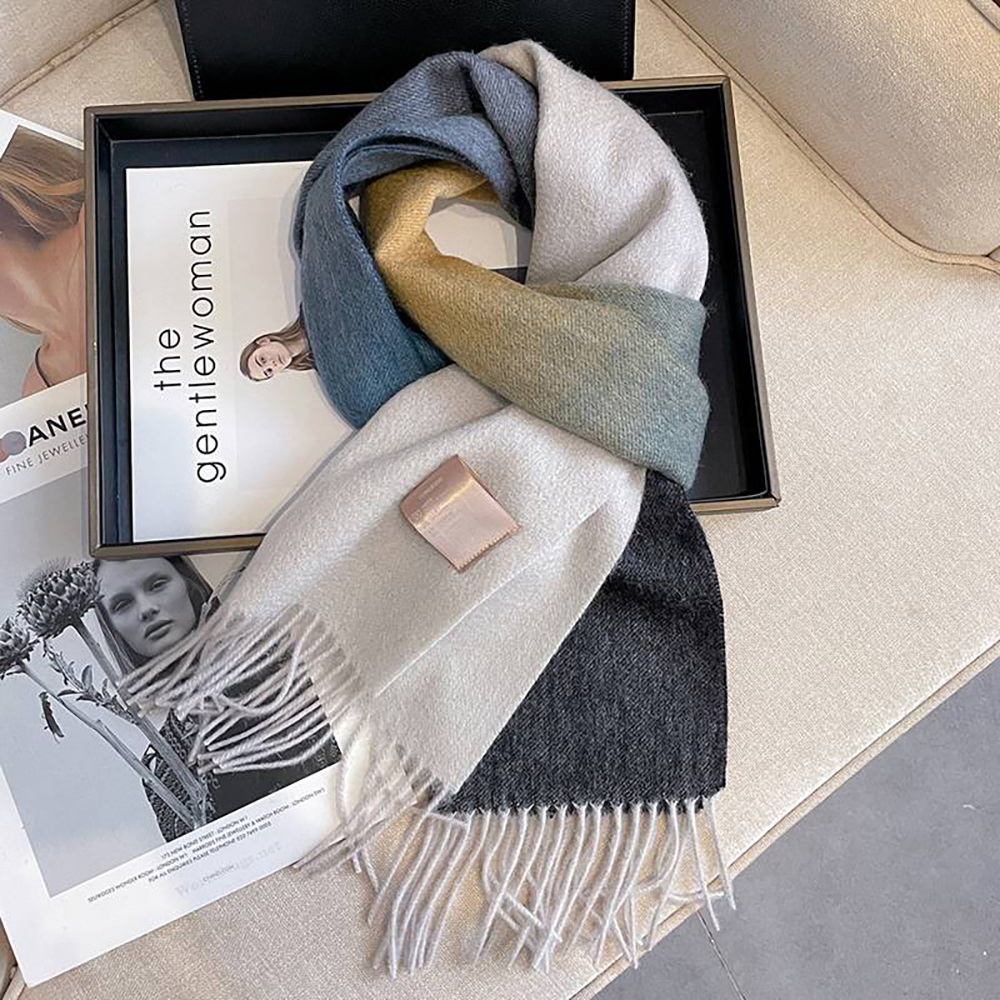 【VEDINA】100%澳洲羊毛 黑灰藍漸層拼色純羊毛加長版流蘇圍巾 30*210 cm(男女保暖質感披肩圍脖)