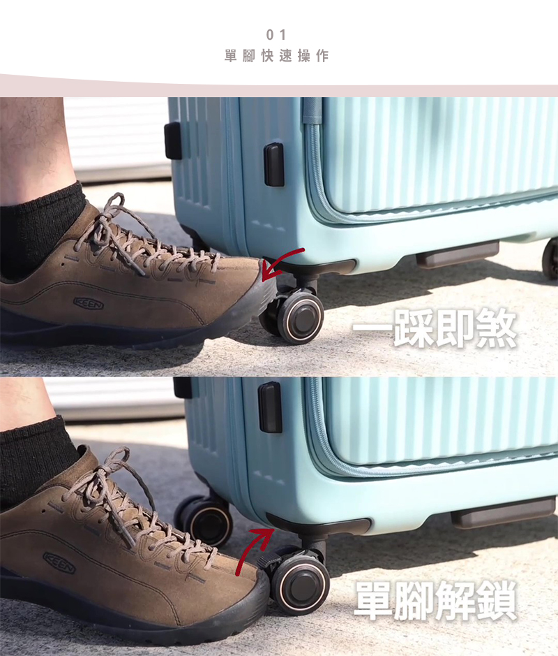 ● 雙軸心避震煞車輪 一踩即煞+靜音滑順