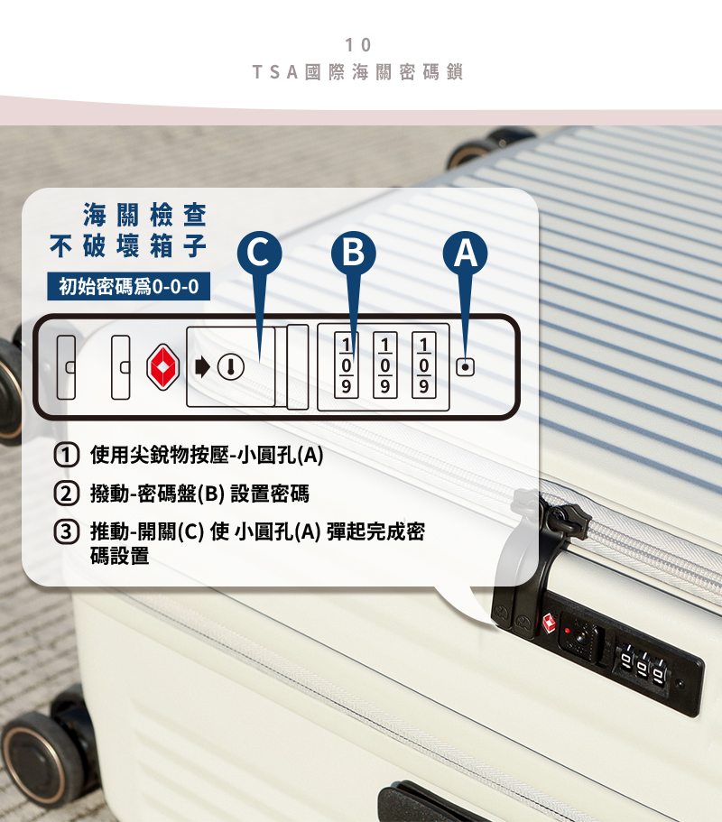 ● 專屬國際TSA海關三碼密碼鎖,保護更加分
