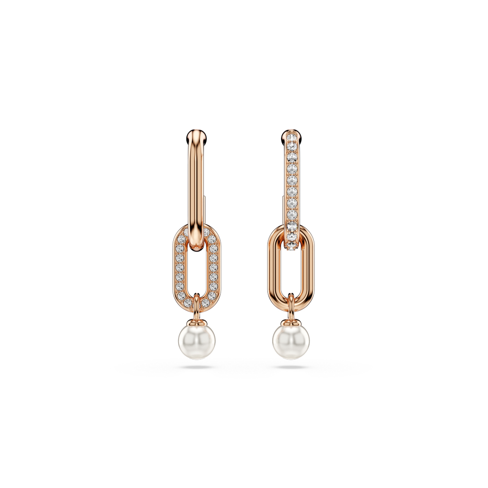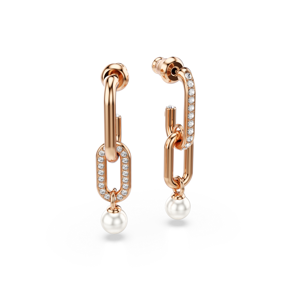 這款玫瑰金色調耳環將優雅化為藝術。每只耳環都以兩個相互連結的鏈節組成,飾有透明密鑲,單顆 Swarovski 水晶珍珠則優雅垂墜於下。搭配同系列成套鏈墜或手鏈,打造協調造型。