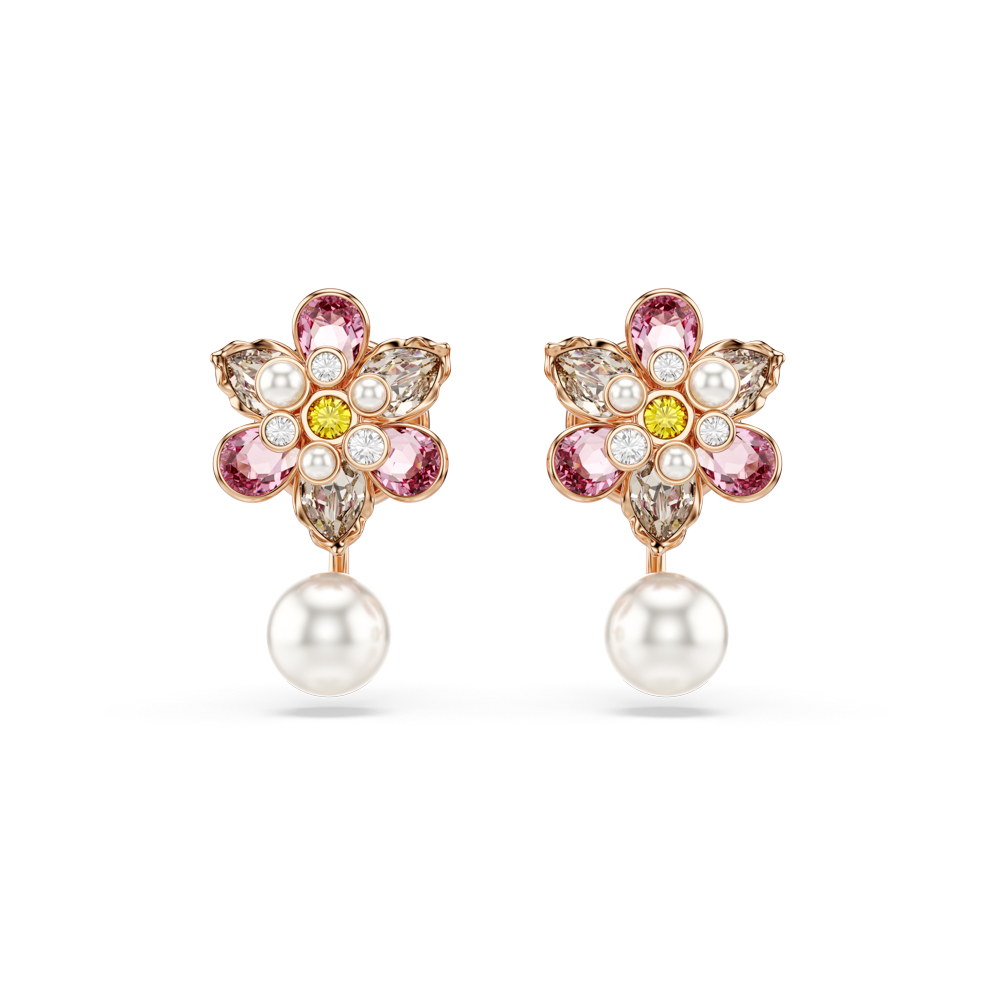 這對閃耀動人的穿式耳環在最小的細節中展現美感。每只鍍玫瑰金色調耳環皆以各種不同切割和柔和色彩的水晶組成花朵造型,下方則飾有可拆式 Swarovski 水晶珍珠「外套」。這款以大自然為靈感的耳環是日常穿搭的理想之選,並可完美搭配同系列其他珠寶。