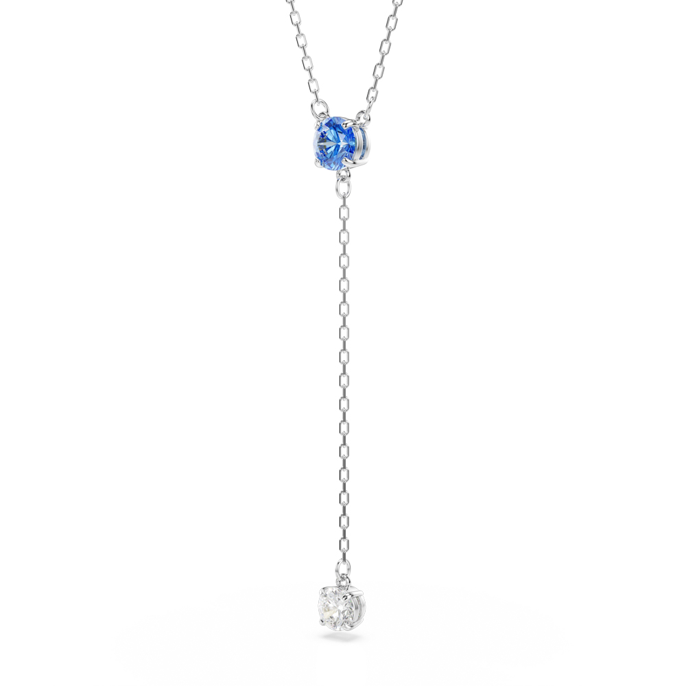 這款項鏈造型簡約並在其中注入色彩,純粹展現 Swarovski 的歡樂風格。鍍銠設計採用藍色圓形切割 Swarovski 水晶主石,下方以精緻鏈條懸掛一顆透明色 Swarovski 鋯石。佩戴這款光芒四射的單品,讓您的造型在任何特殊場合都能散發光芒。