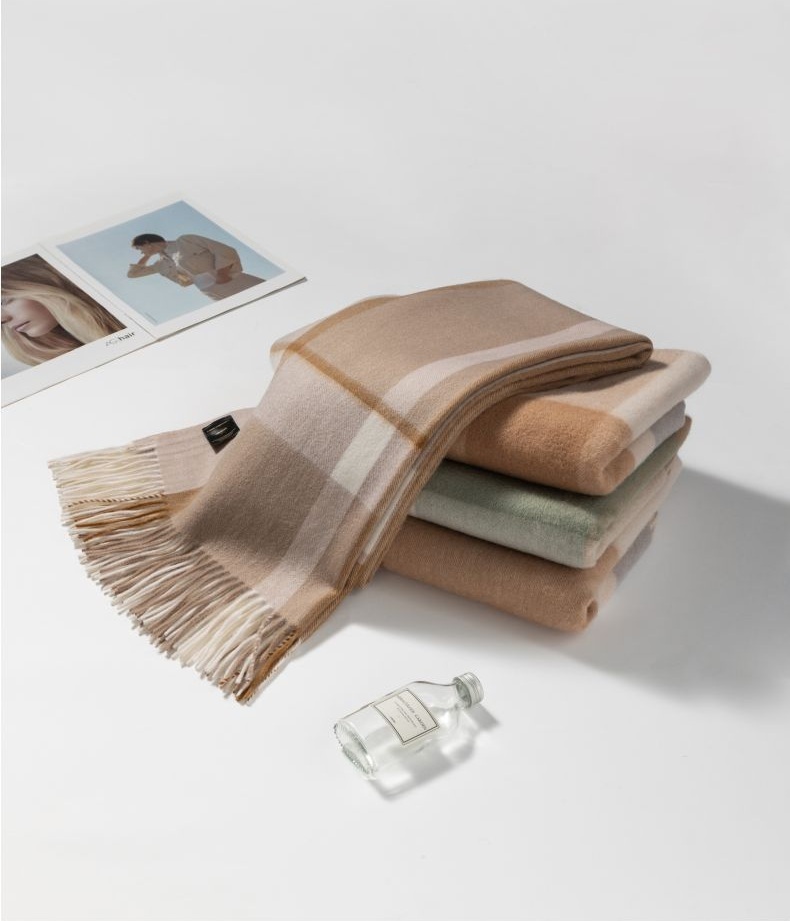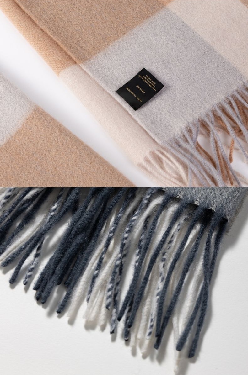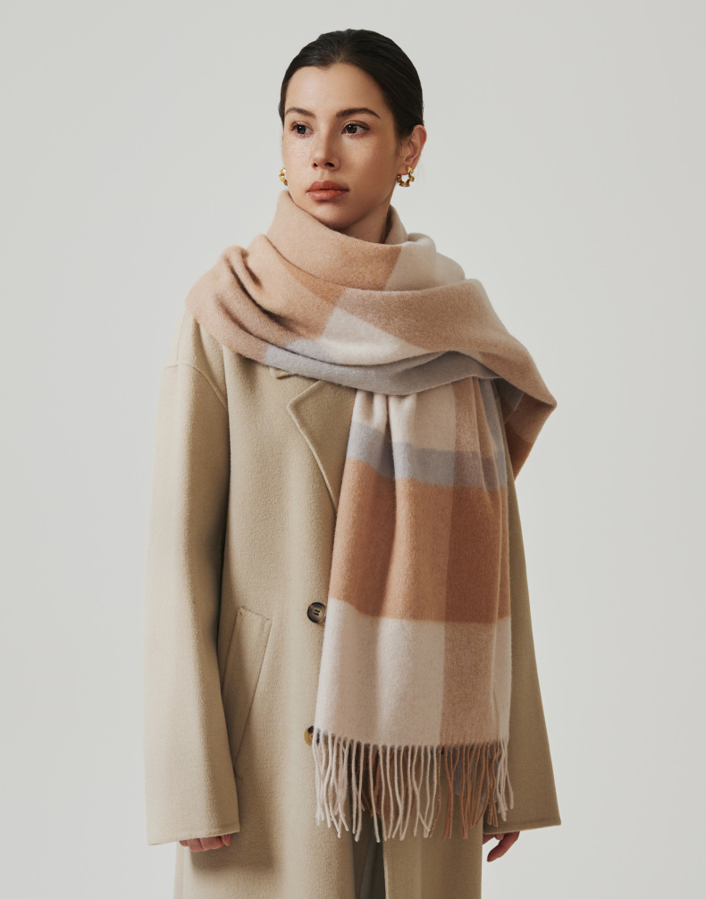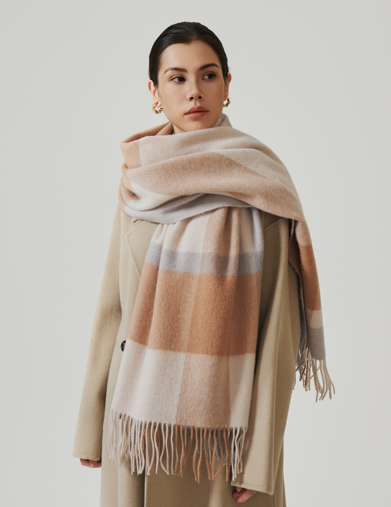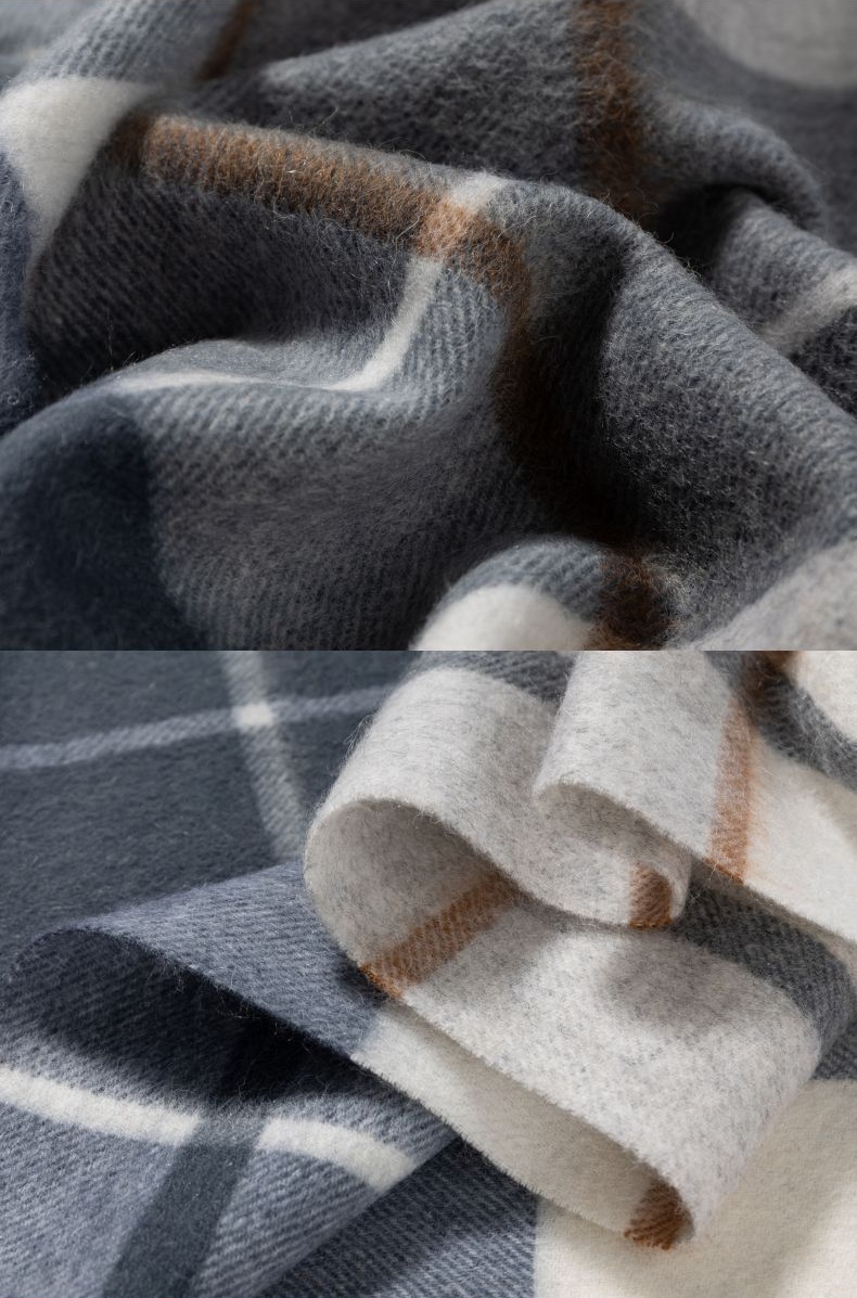 【VEDINA】100%純羊毛超大披肩圍巾 經典格紋 68*197 cm(灰卡其粉藍橘棕色/保暖流蘇設計/男女披巾圍脖)