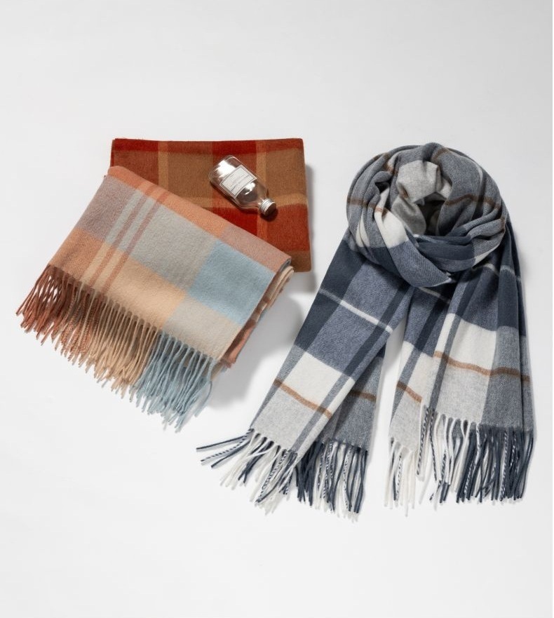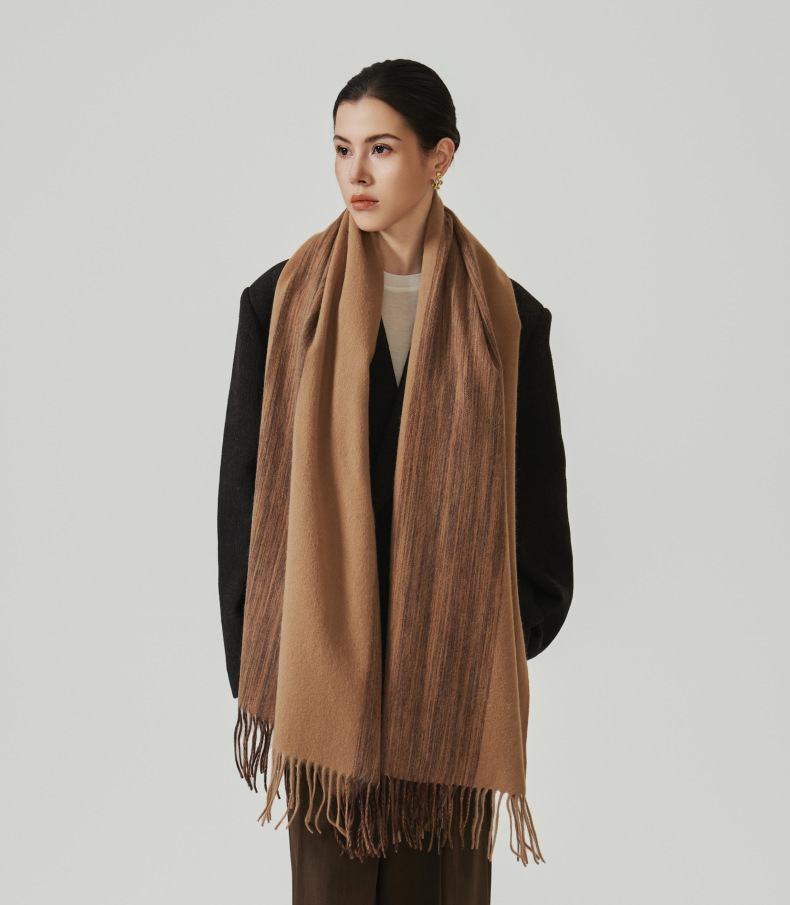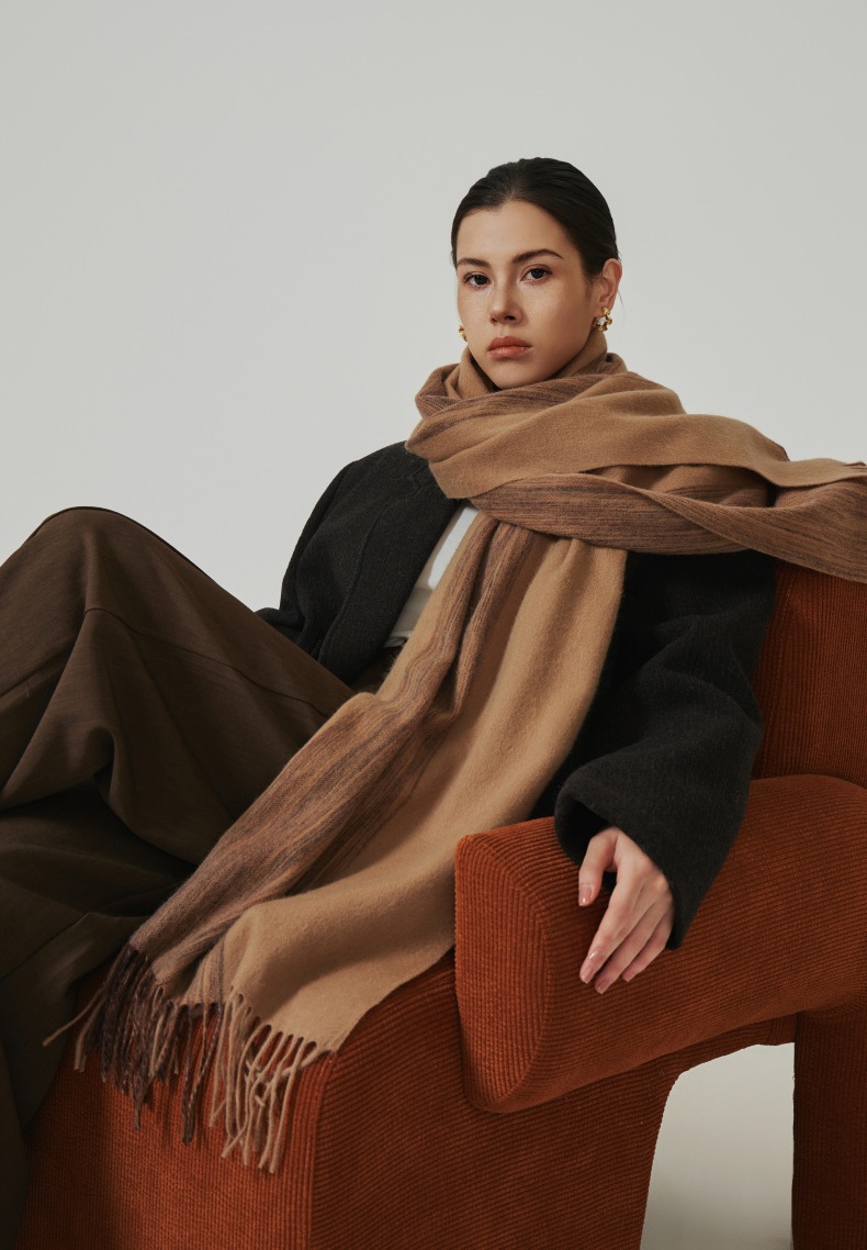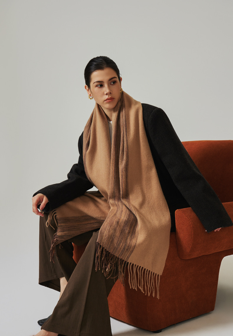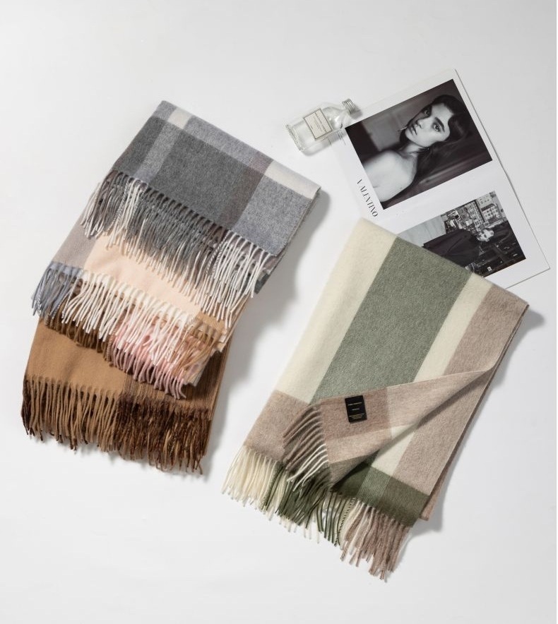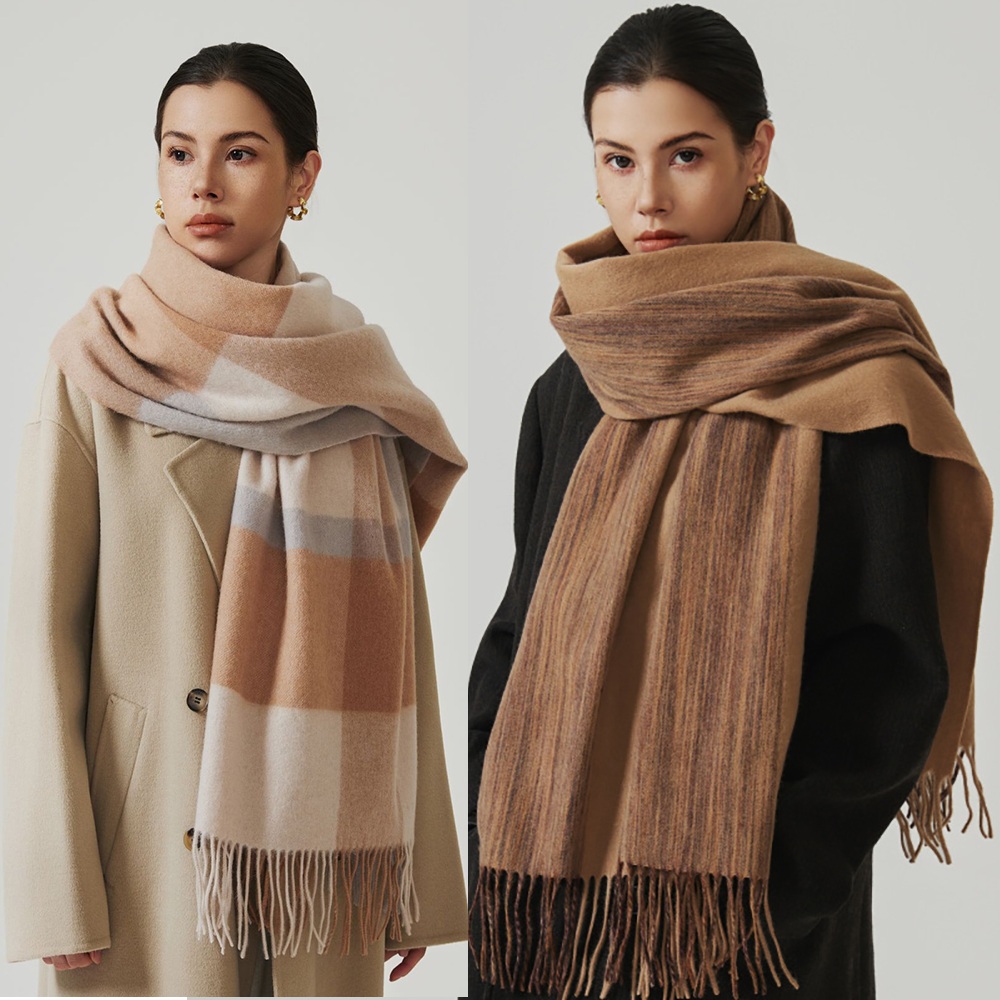 【VEDINA】100%純羊毛超大披肩圍巾 經典格紋 68*197 cm(灰卡其粉藍橘棕色/保暖流蘇設計/男女披巾圍脖)