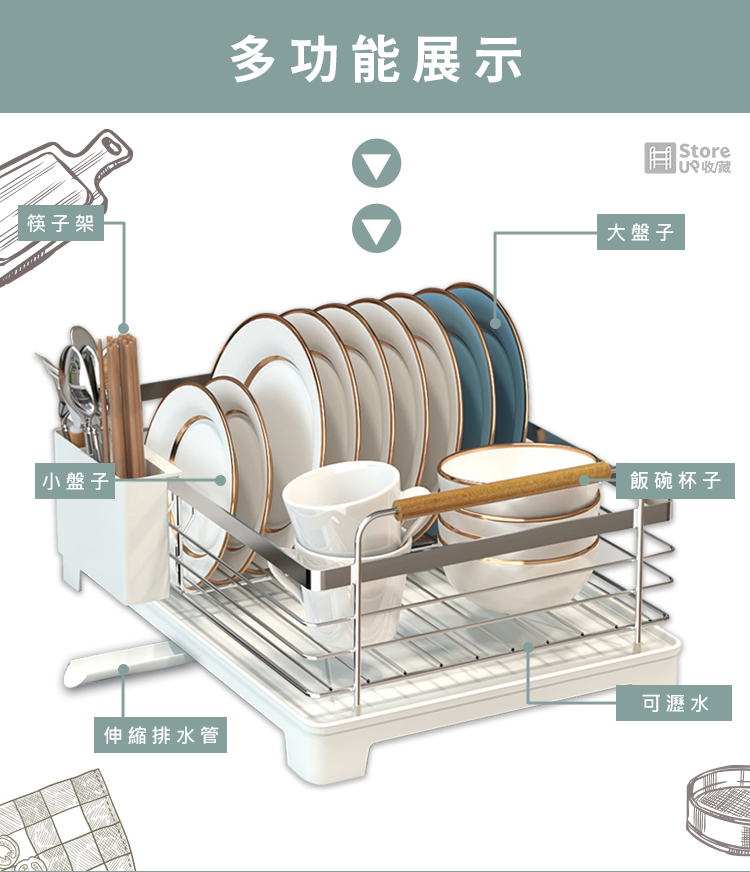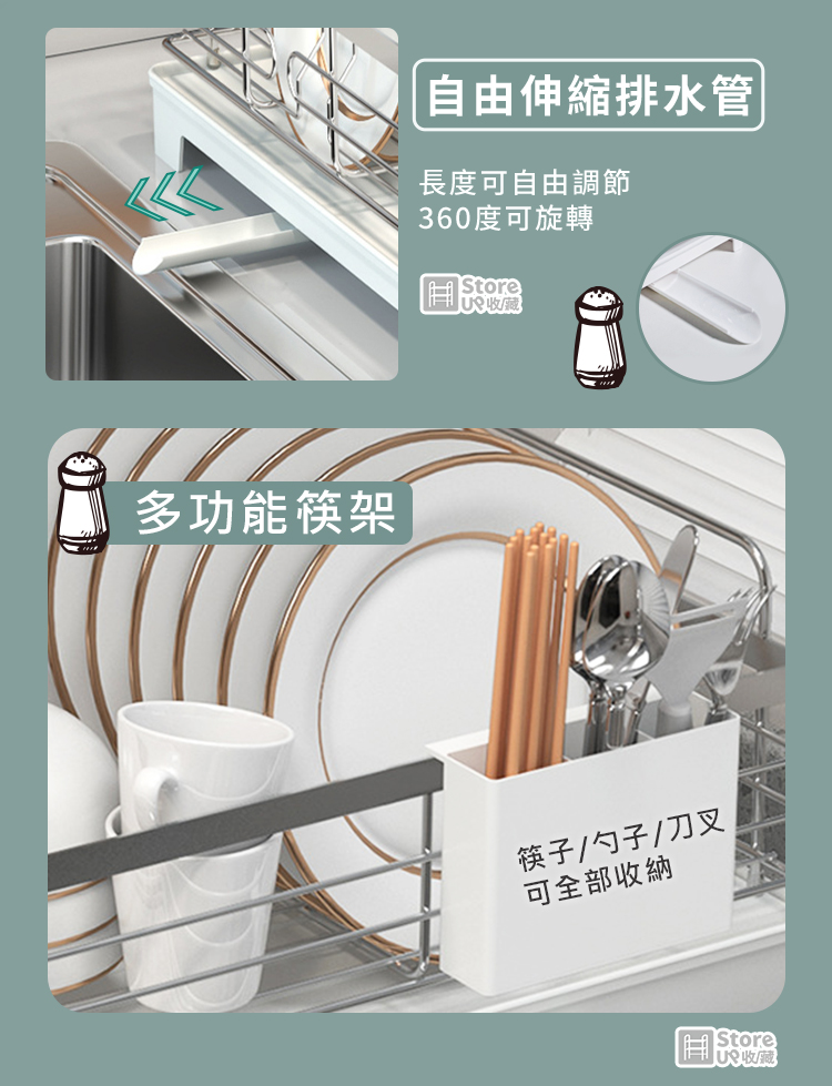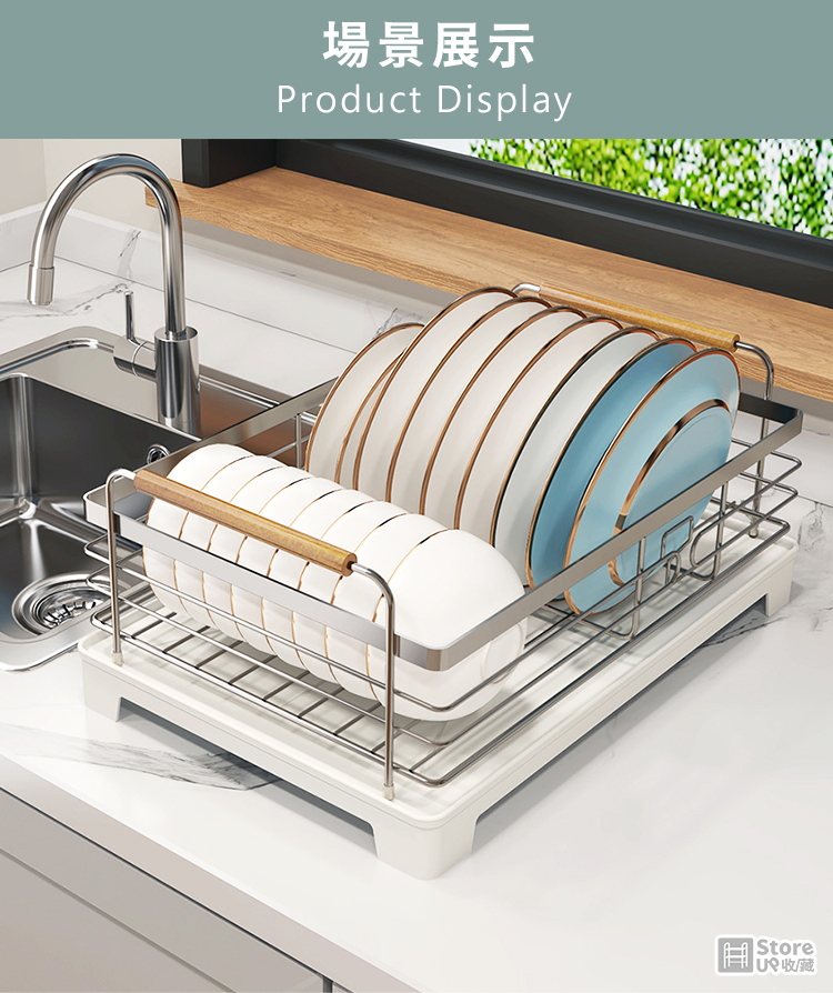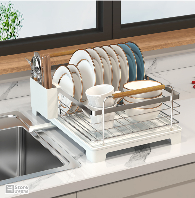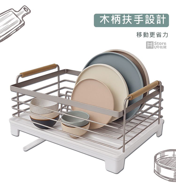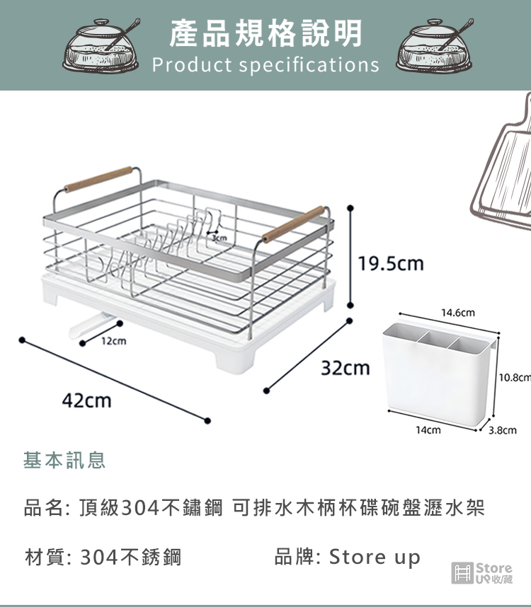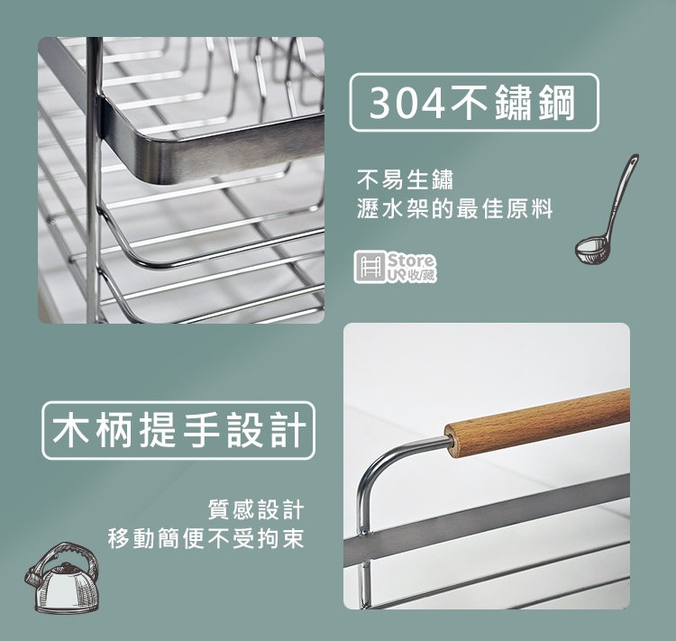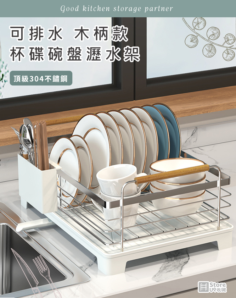 【Store up 收藏】頂級304不鏽鋼 可排水 木柄杯碟碗盤瀝水架-含餐具筒(AD509)