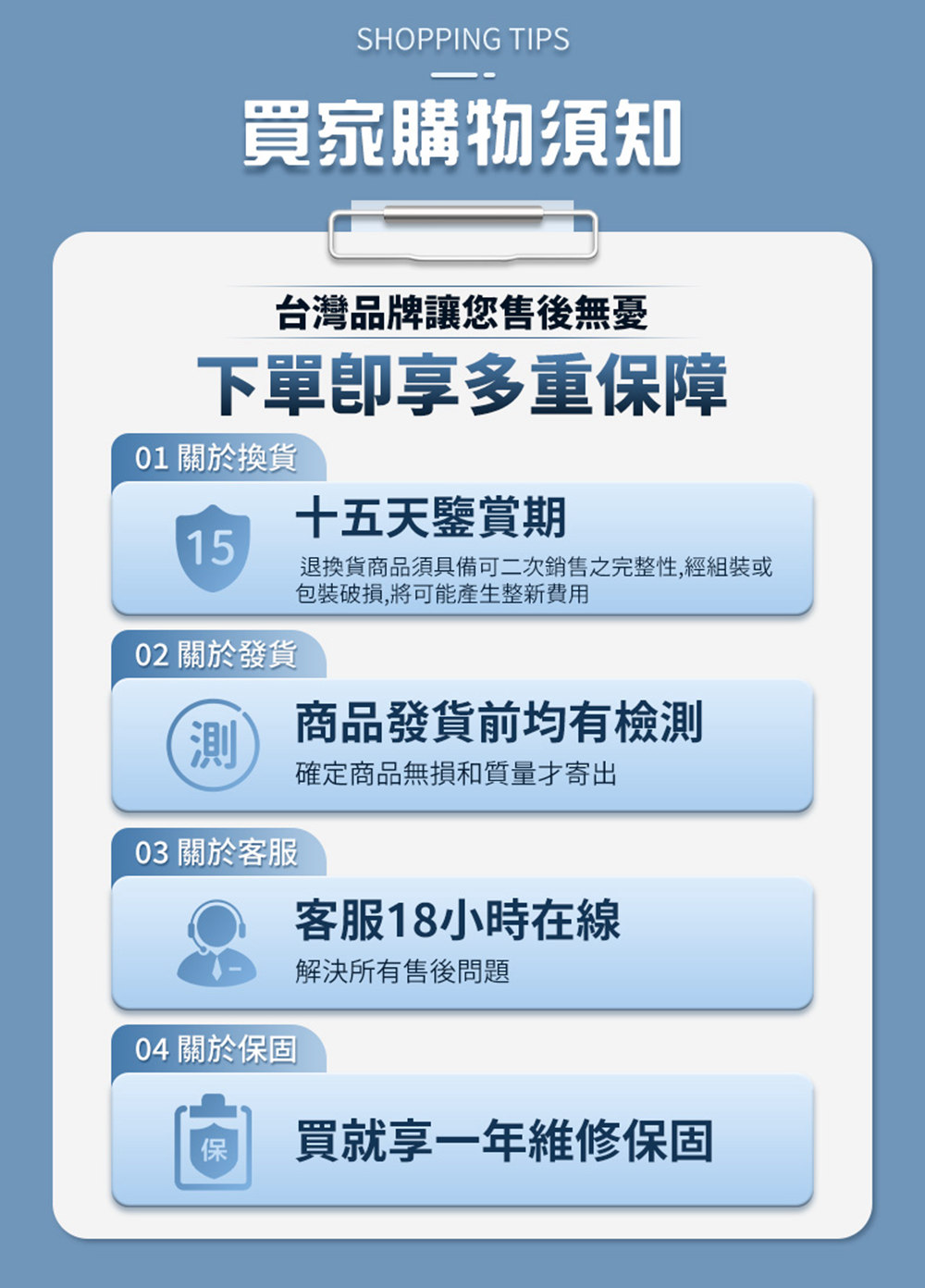 商品出貨後售後保固聯絡資訊:0255784537,15天鑒賞期,一年保固服務