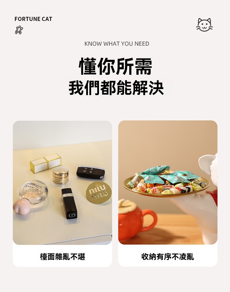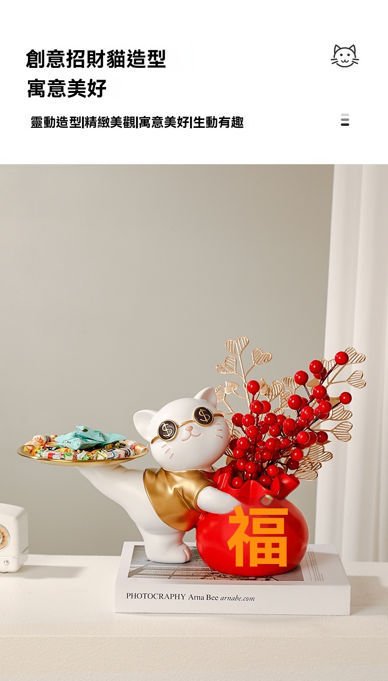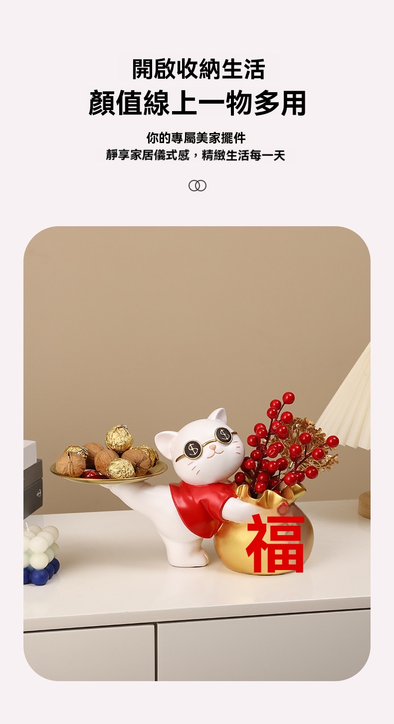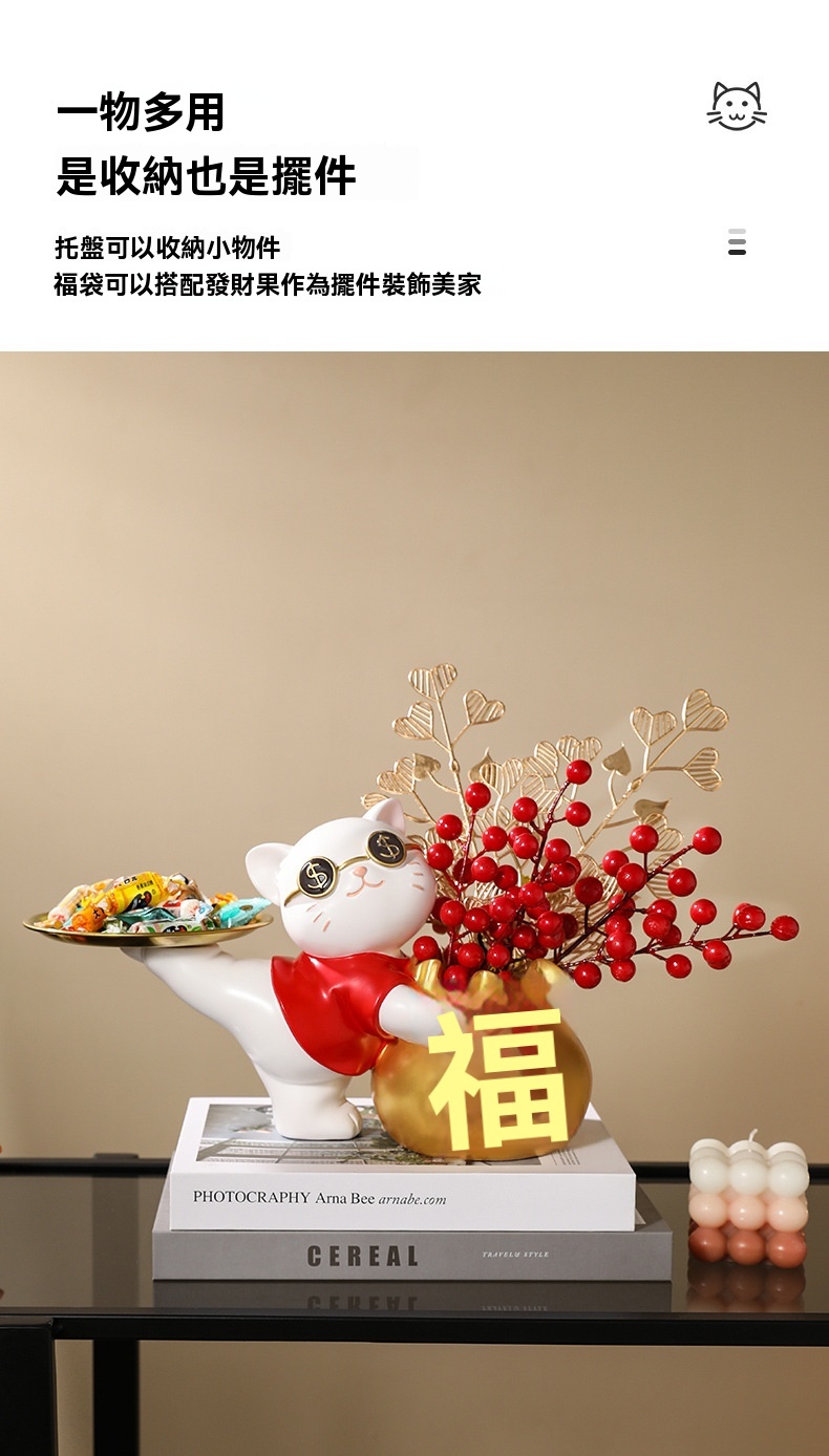 【由米】招財貓 招財擺飾 玄關收納 喬遷禮品 置物架(35*31 樹脂材質 不鏽鋼托盤 收納)