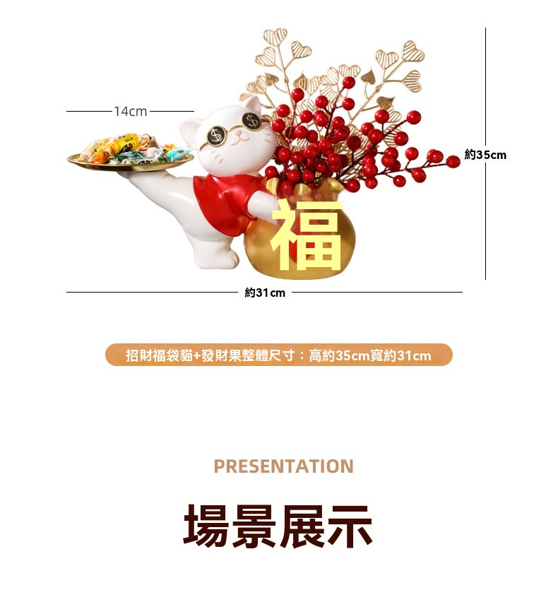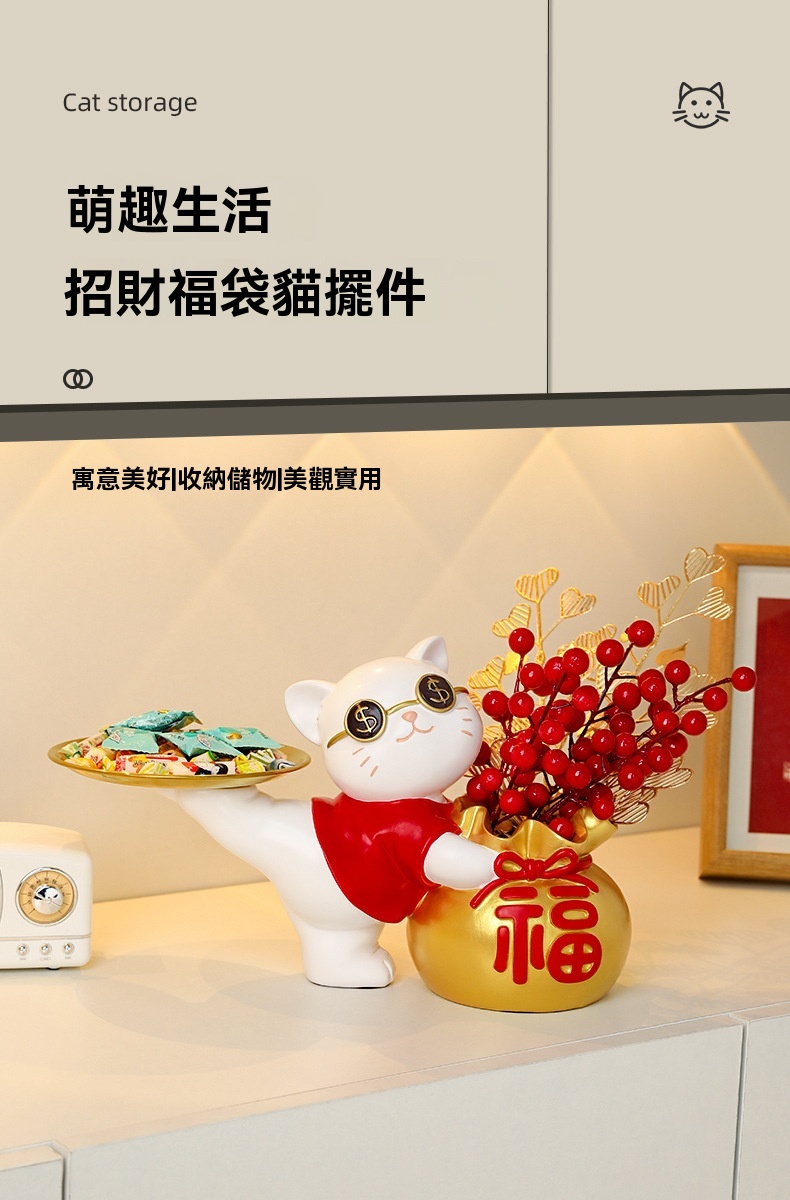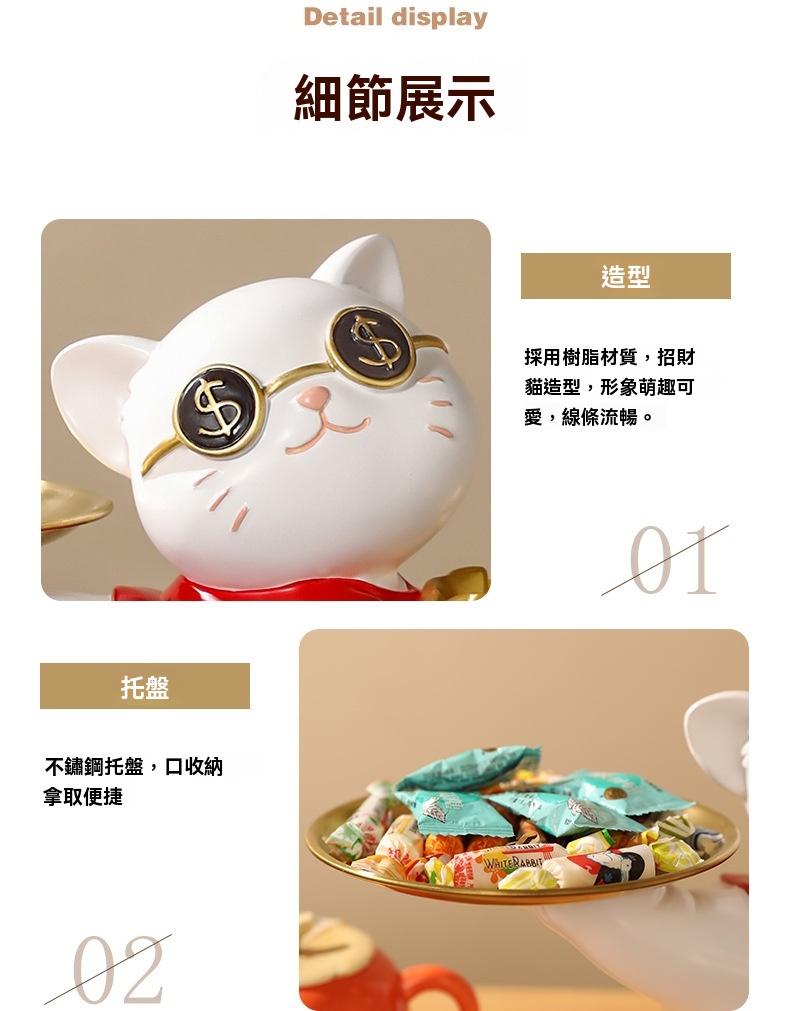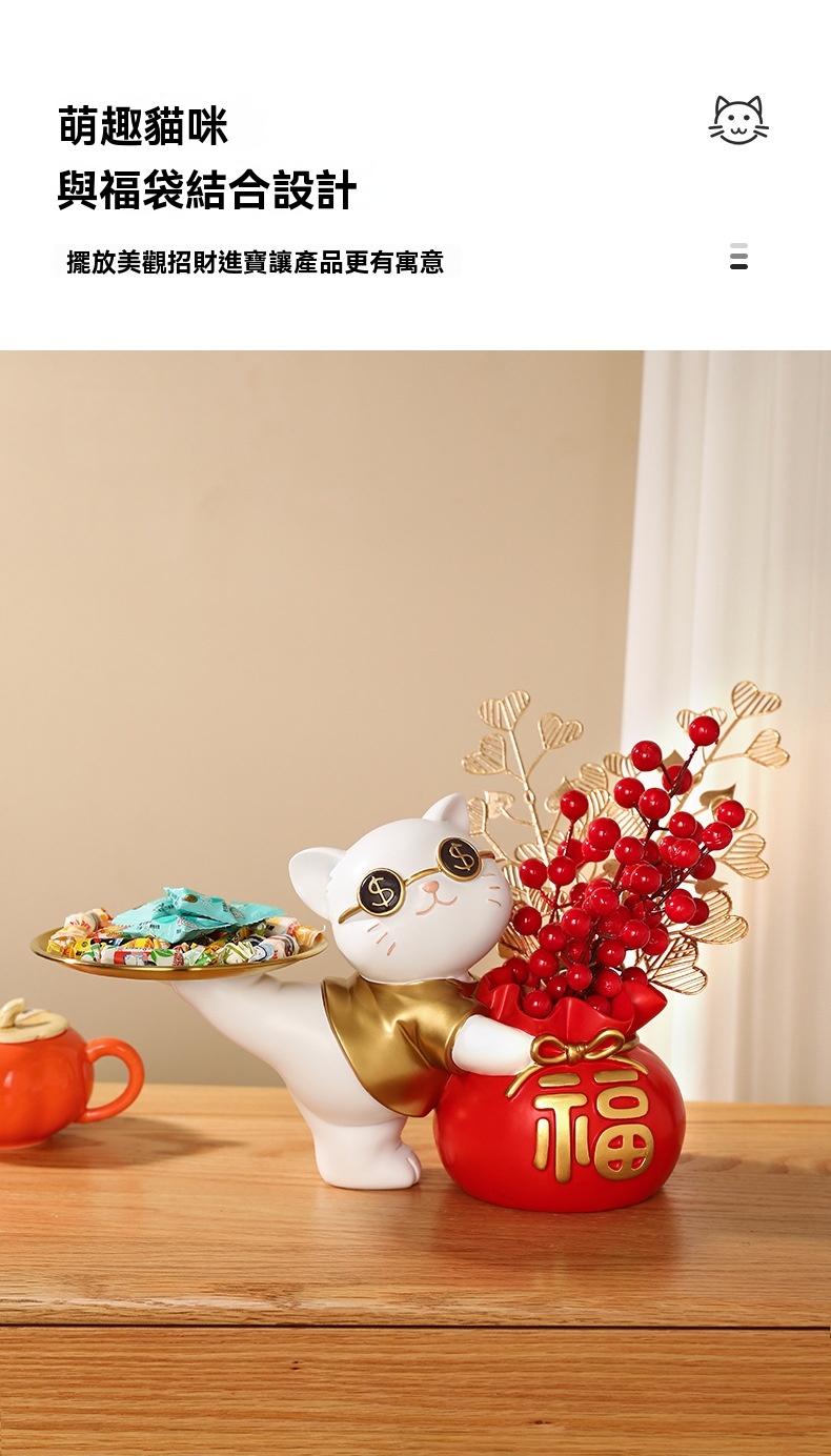 【由米】招財貓 招財擺飾 玄關收納 喬遷禮品 置物架(35*31 樹脂材質 不鏽鋼托盤 收納)