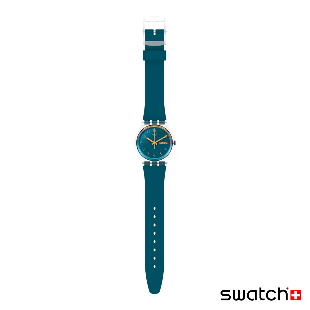 BLUE AWAY (SO28K700) 搭配深藍綠色錶帶與同色錶盤,採用絢麗的 Swatch 太陽光譜錶鏡。點綴橘色指針顯示時間,3 點鐘位置搭配橘色星期日期視窗。