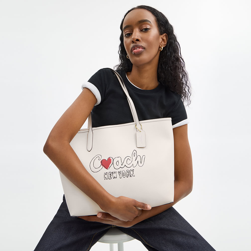 【COACH】蔻馳官方直營 CITY托特包 托特手袋COACH文字圖案-IM/粉筆白色 混合色(CBS70)
