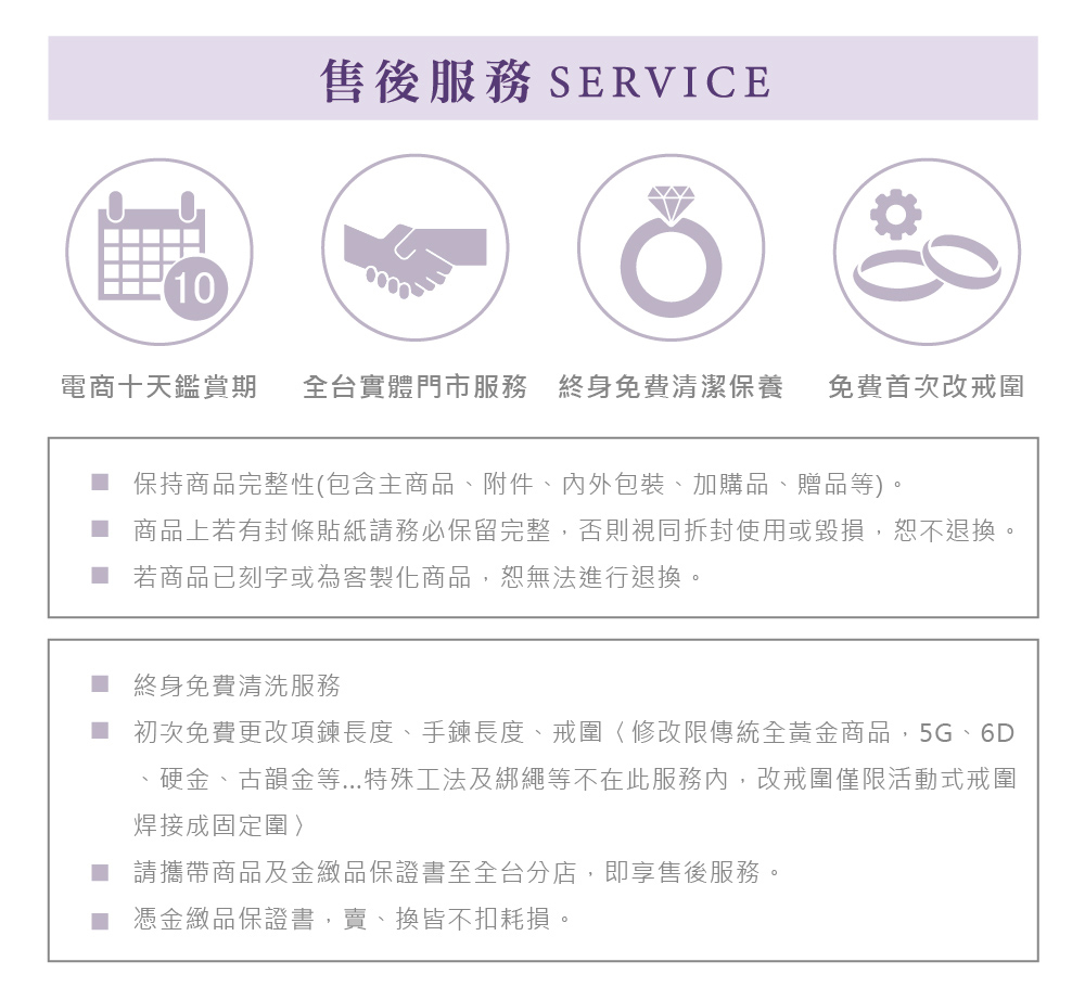 (限傳統全黃金商品;5G、6D、硬金、古韻金等...特殊工法及綁繩等不在此服務內)修改戒圍服務限”活動式”戒圍焊接成固定圍。