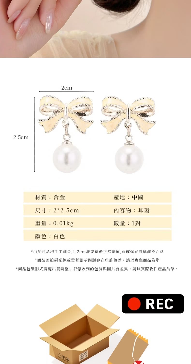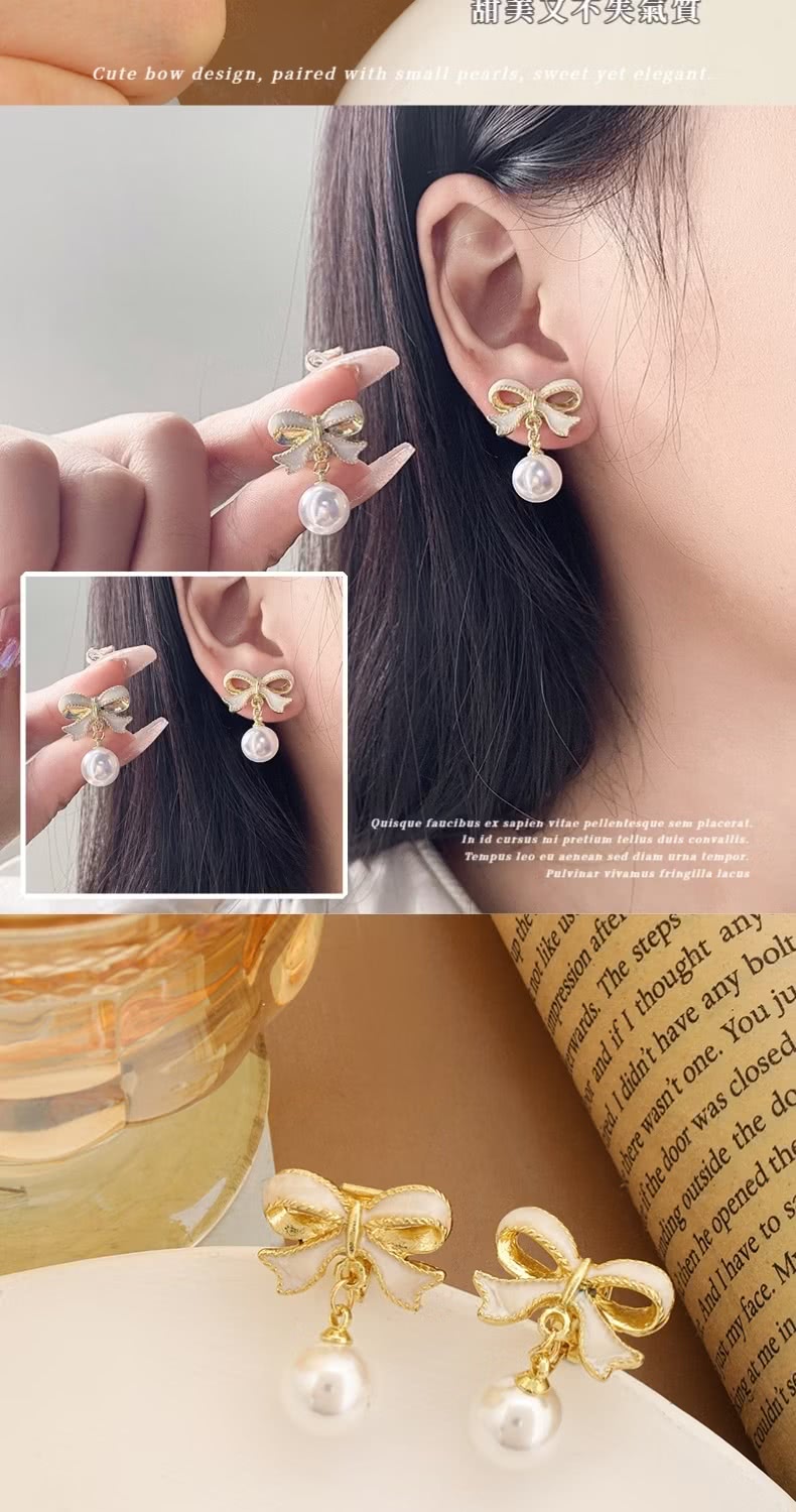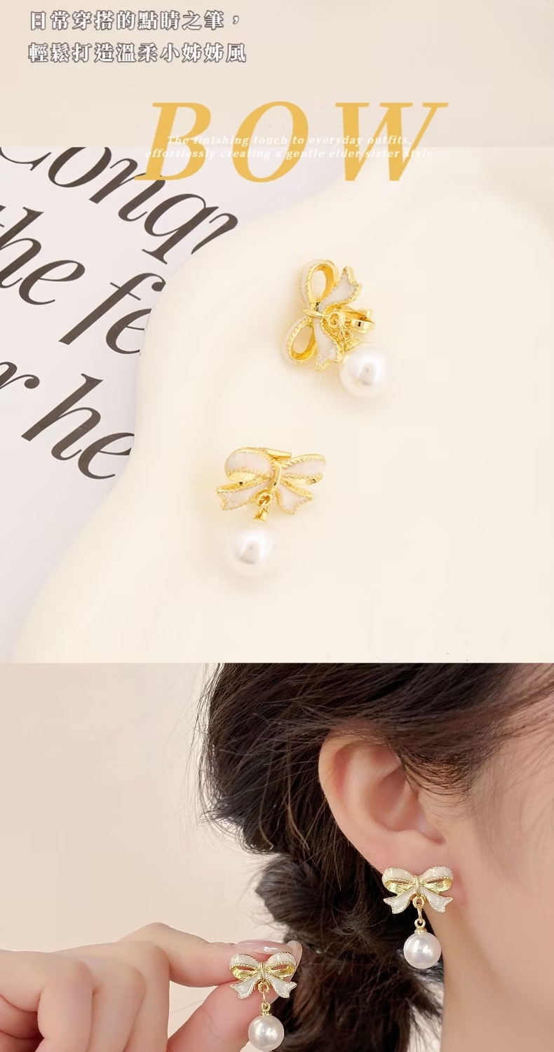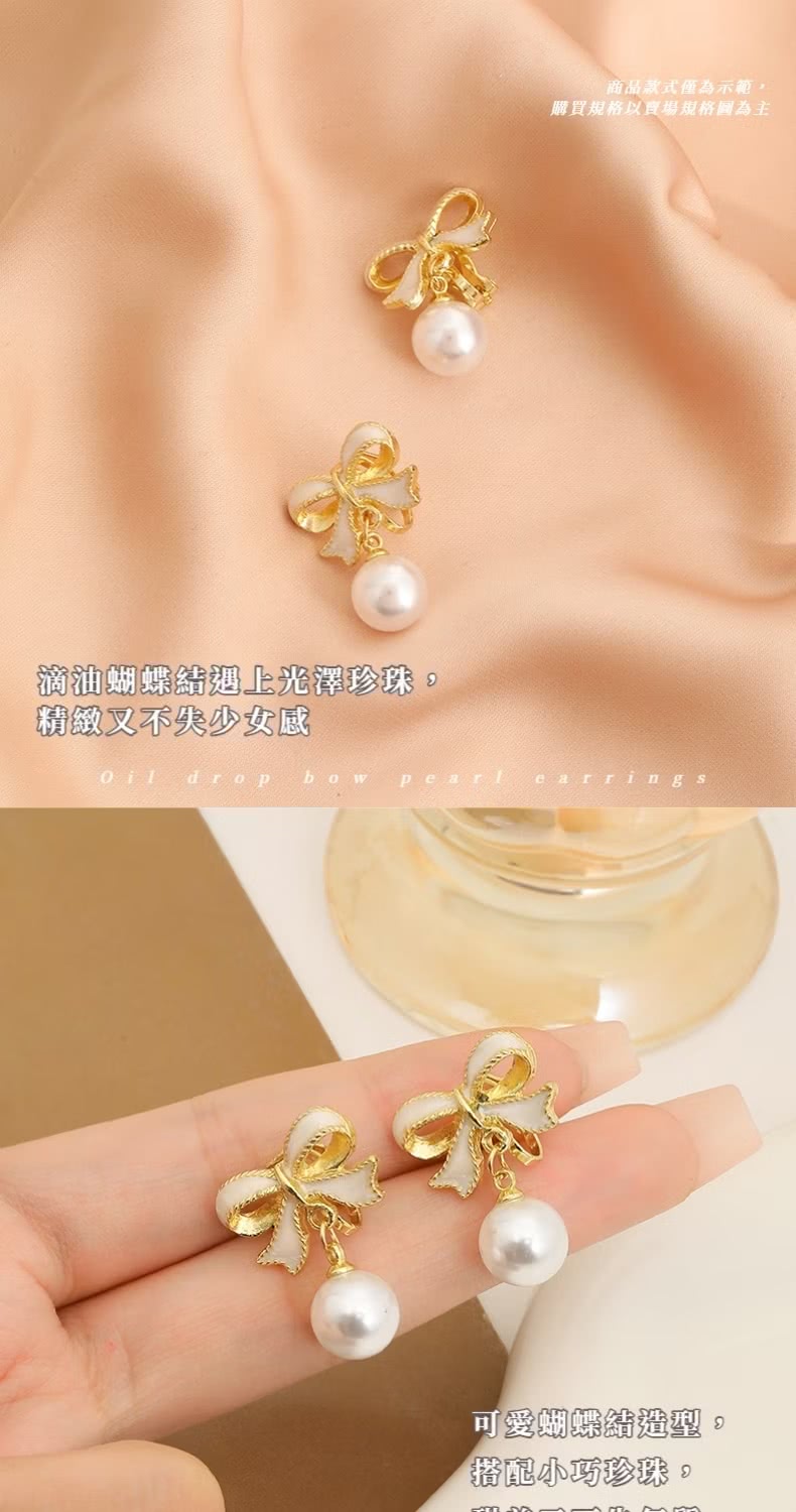 【法式耳飾】滴油蝴蝶結珍珠耳環1對(鑲鑽 水鑽 耳墜 飾品 耳針 耳釘 首飾 垂墜耳環 情人節 送禮物)