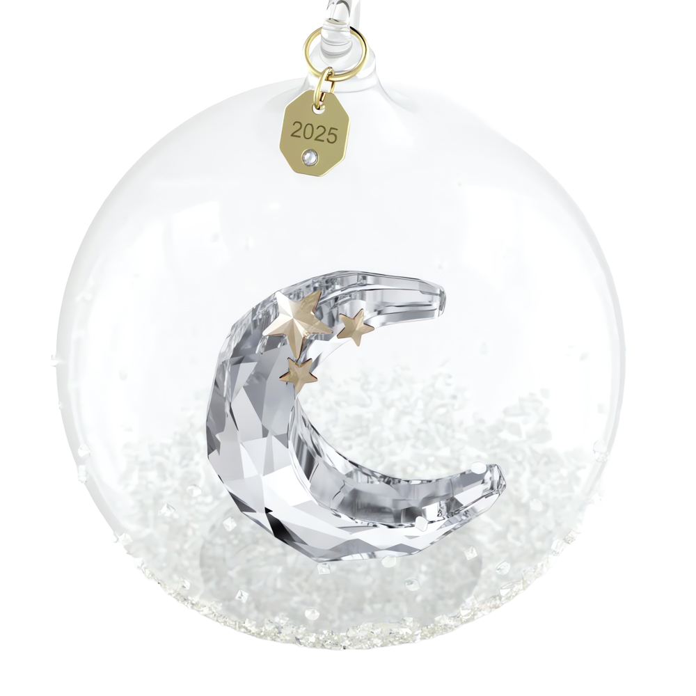 Swarovski 2025 年 Annual Edition 聖誕球掛飾散發著月光的光輝,造就一份與摯愛分享的永恆禮物。閃爍的玻璃球點綴約 2,200 顆 Swarovski 水晶,懸掛於白色蔥紗緞帶上,緞帶繫有鍍香檳金色調標籤,上面鐫刻「2025」字樣。球體內安坐著一彎寧靜的新月,飾以金色星星,並展現 158 個精準切割的切割面。這款 Annual Edition 聖誕球掛飾是紀念生日、婚禮或週年的理想之選。裝飾品。非玩具。不適合 15 歲以下兒童。