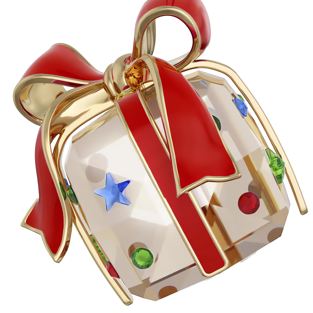 這款俏皮的禮品包裝造型掛飾是任何聖誕樹上的理想裝飾。懸掛在紅色蔥紗緞帶上的包裹設計採用 Swarovski 金色魅影效果和 426 個切割面,同時飾有紅色、綠色和藍色的裝飾水晶。緞帶以香檳金色調金屬搭配紅色漆面製成。在您自己的佳節擺設中加入這款掛飾,或將其作為禮物送給特別之人,帶來節日歡樂氣氛。裝飾品。非玩具。不適合 15 歲以下兒童。