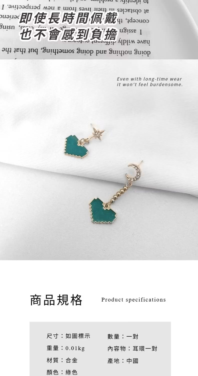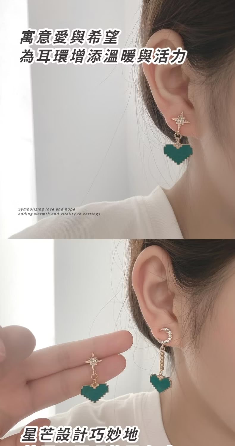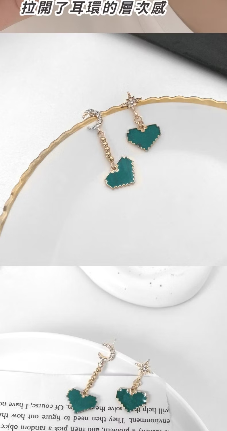 【日系甜美】鑲鑽星芒月亮綠愛心耳墜耳環(不對稱 耳針 耳釘 耳飾 穿搭配件 飾品 復古 洋裝)