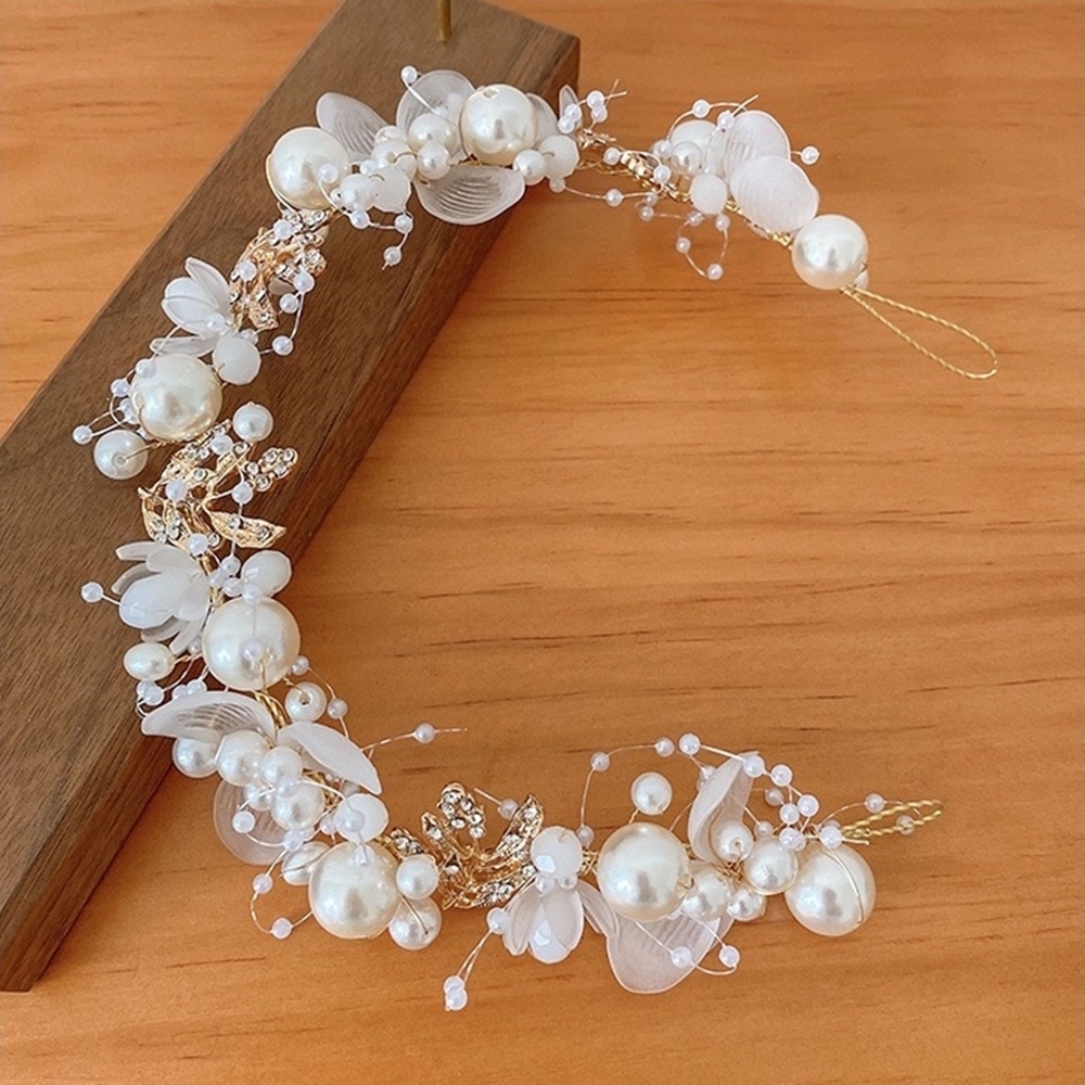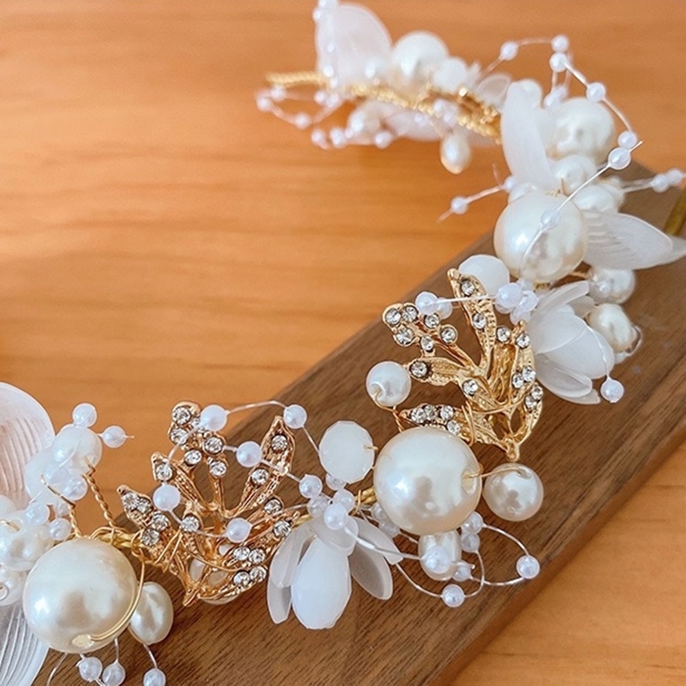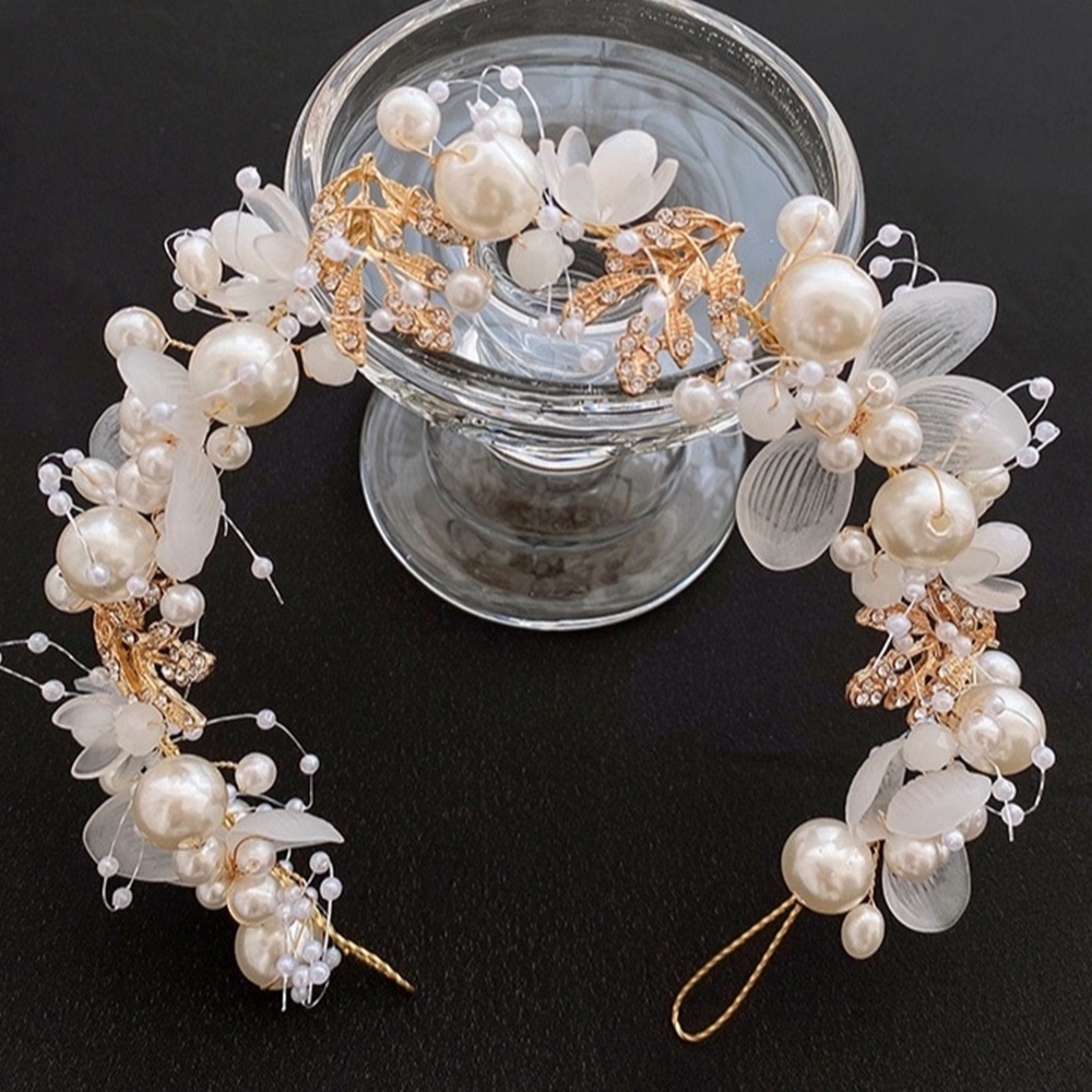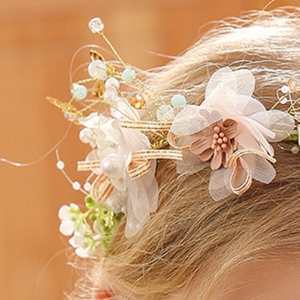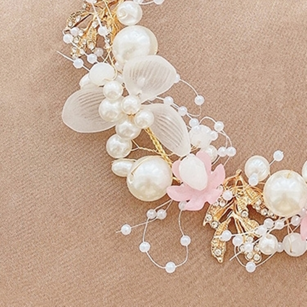 立體花朵水晶珠、仿珍珠金絲枝葉唯美柔和色系 夢幻花精靈柔軟金屬線基底設計 彈性佳